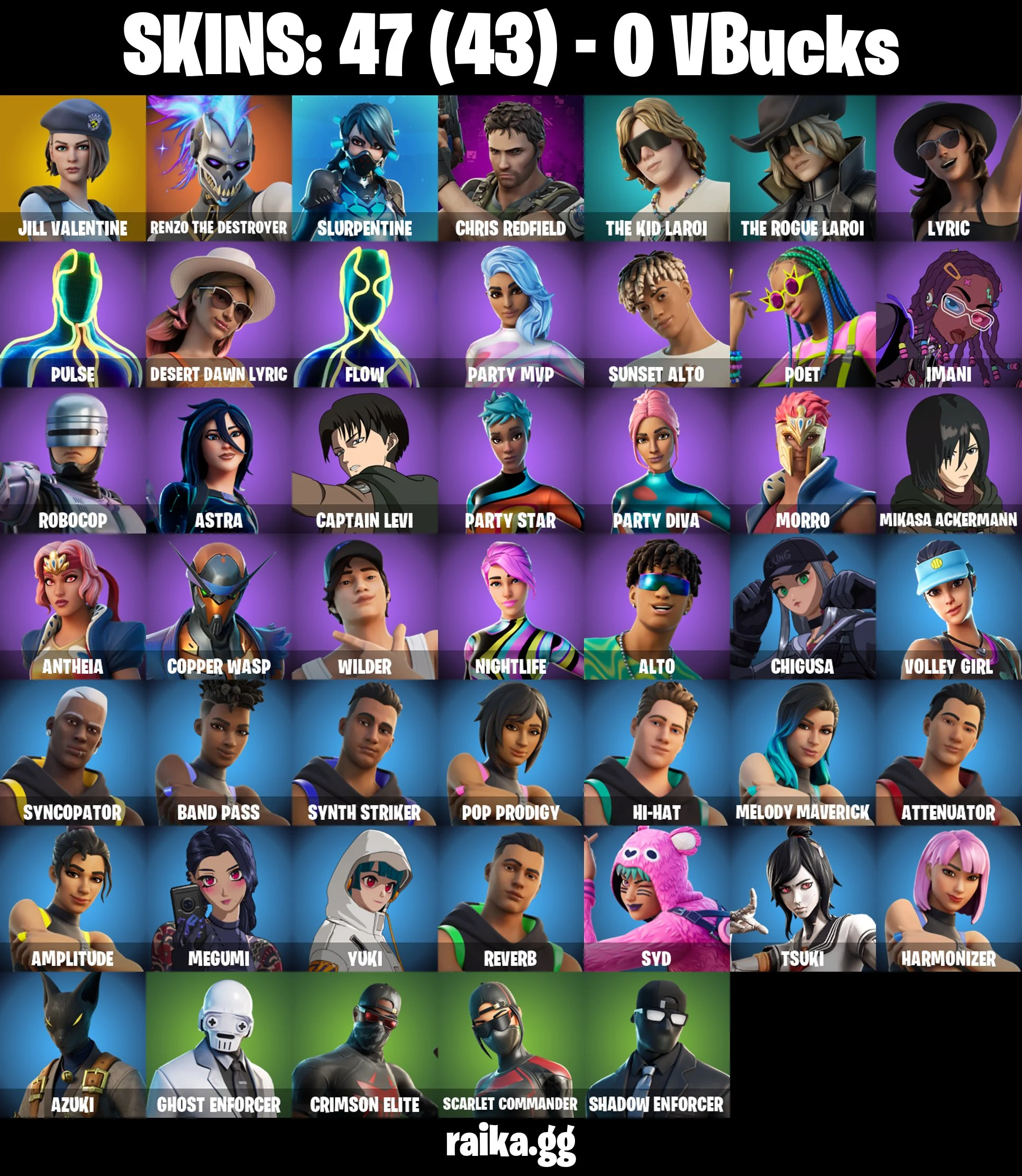 Original Email ✅ Inactive for 3 years | Captian Levi | Mikasa Ackermann | 47 skins | Jill Valentine | Renzo the Destroyer | Slurpentine | Chris Redfield | The Kid LAROI | The Rogue LAROI | Lyric | Pulse | Desert Dawn Lyric | 0 VB