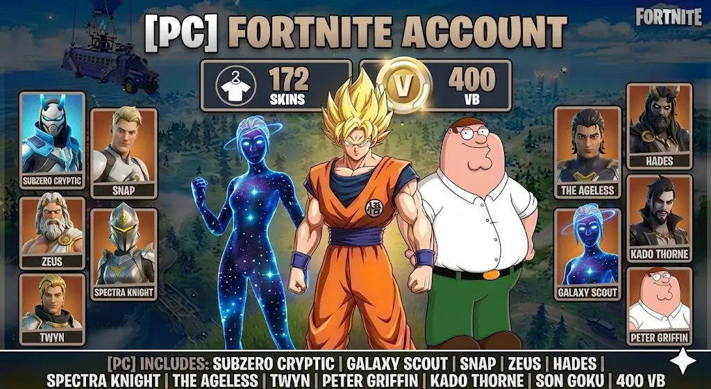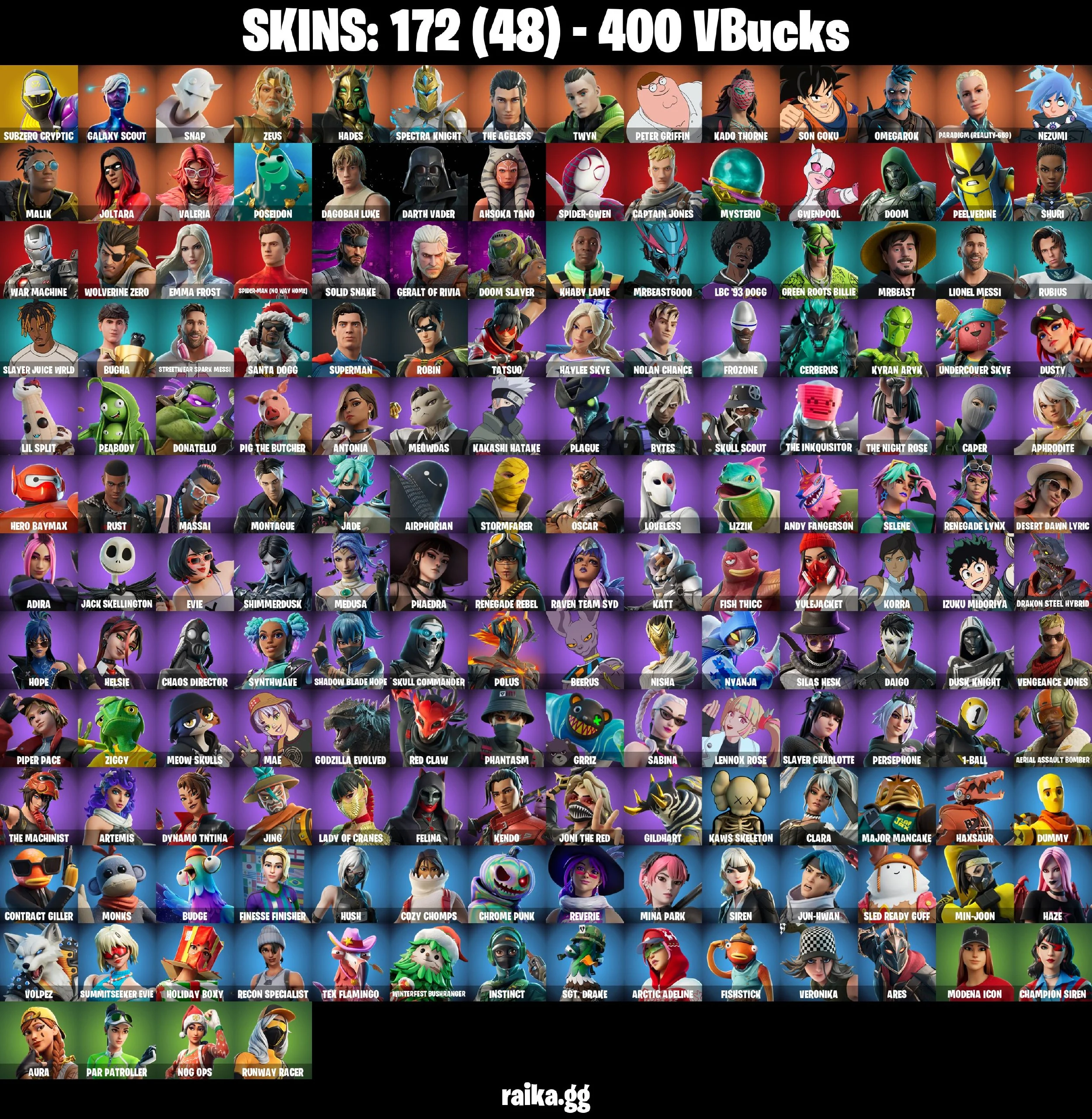 [PC] 💻 172 Skins👕 | Subzero Cryptic⚡ | Reaper⛏ | Poki🕺 | Candy Axe🍭 | Galaxy Scout🌌 | Son Goku🐉 | Darth Vader🖤 | Spider-Gwen🕷 | Doom💚 | 400 VBucks💸
