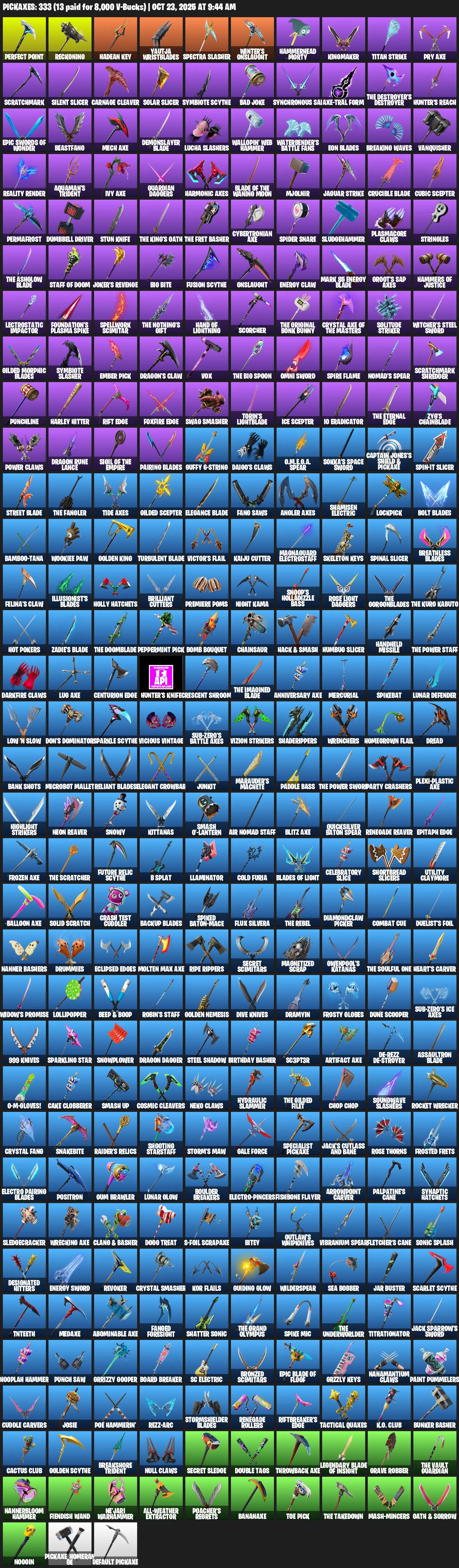[PC] 310 skins | 333 pickaxes | 255 emotes | Gold Brutus | Gold Midas | Gold Meowscles | Gold TNTina | Prodigy | Vivi Chroma | The Visitor | Hybrid | 1,700 Vbucks
