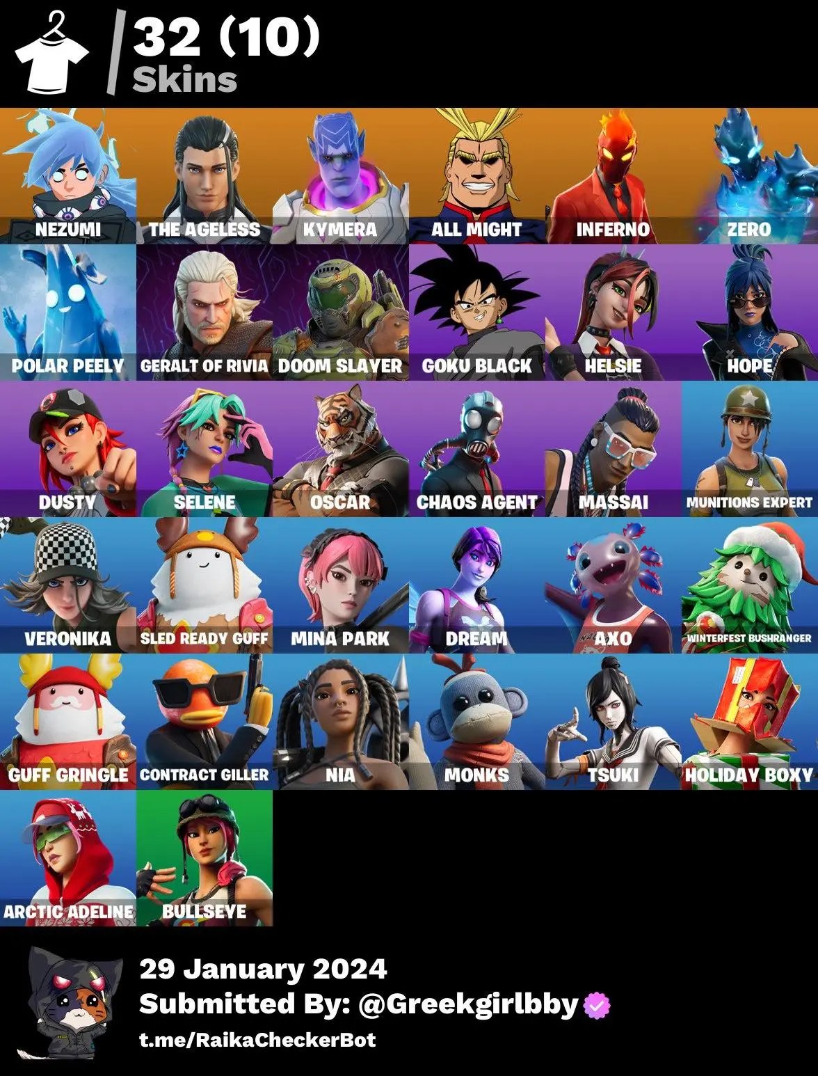 [PC] 32 skins | Kymera |All Might | Dusty | Inferno | Zero | Polar Peely | Doom Slayer | Geralt of Rivia | Goku Black | Helsie