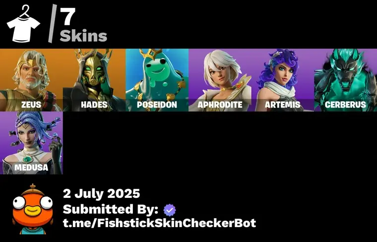 [PC] 7 Skins | Zeus | Hades | Poseidon | Aphrodite | Artemis | Cerberus | Medusa | Snakebite Keyring | Cozy Conch | Huntress Lyre | 850 VB | FN25