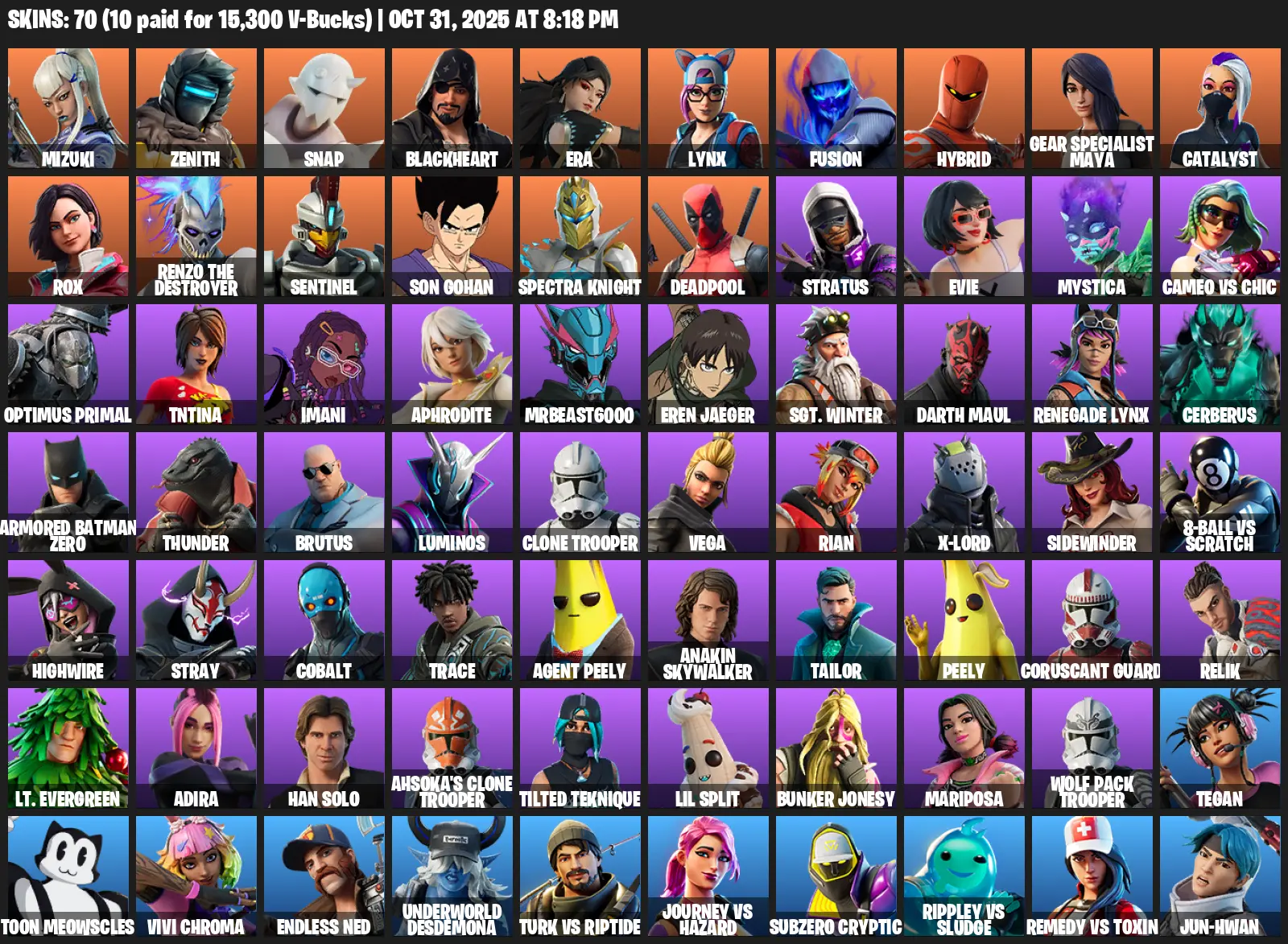 [PC] | 70 skins | Mizuki | Zenith | Snap | Blackheart | Era | Lynx | Fusion | Hybrid | Gear Specialist Maya | Catalyst | Rox | #KEK8894 | #MBFN