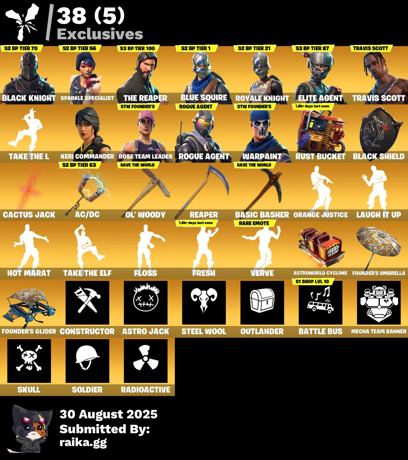 [PC | PSN | XBOX] 105 skins | OG STW | Black Knight | Travis Scott | Sparkle Specialist | The Reaper | Blue Squire | Royale Knight | Elite Agent | Keri Commander | Take The L | 410 VB