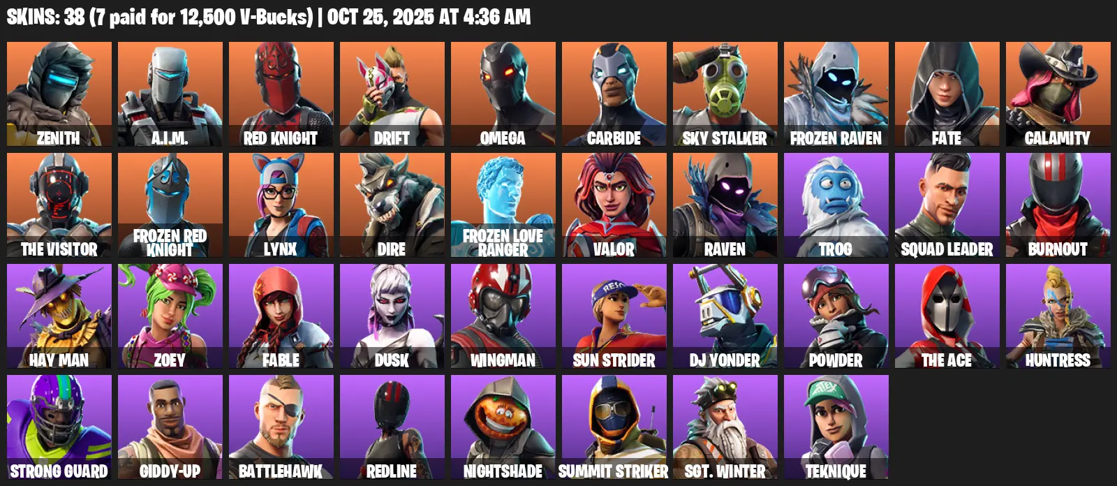 [PC/PSN] | 38 skins | Omega | Zenith | A.I.M. | Red Knight | Drift | Carbide | Sky Stalker | Frozen Raven | Fate | Calamity | The Visitor | S4G