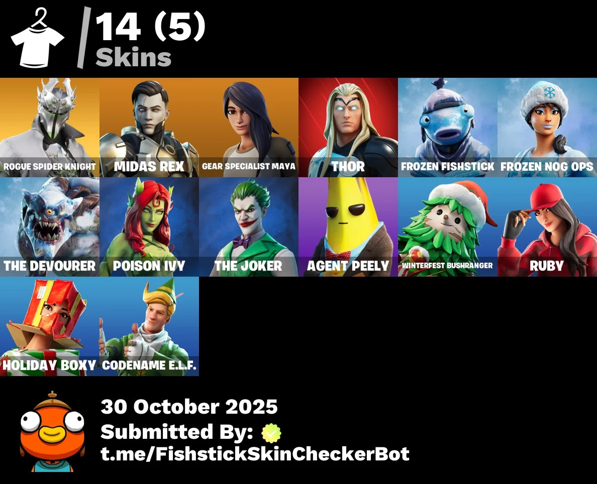 [PC/PSN/NINTENDO] 14 skins | Rogue Spider Knight | Midas Rex | Gear Specialist Maya | Thor | Frozen Fishstick | Frozen Nog Ops | The Devourer | Poison Ivy | 200 VB