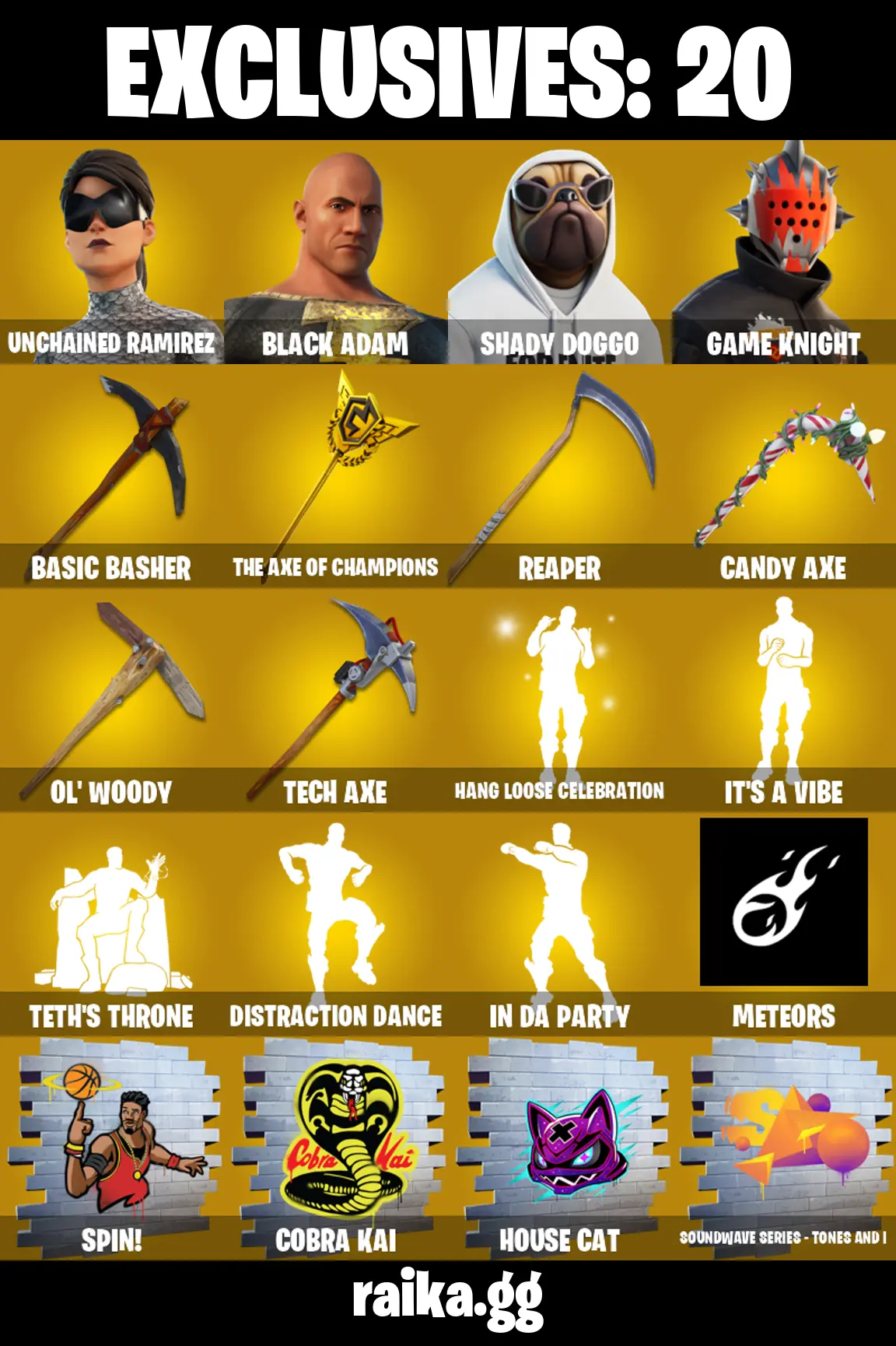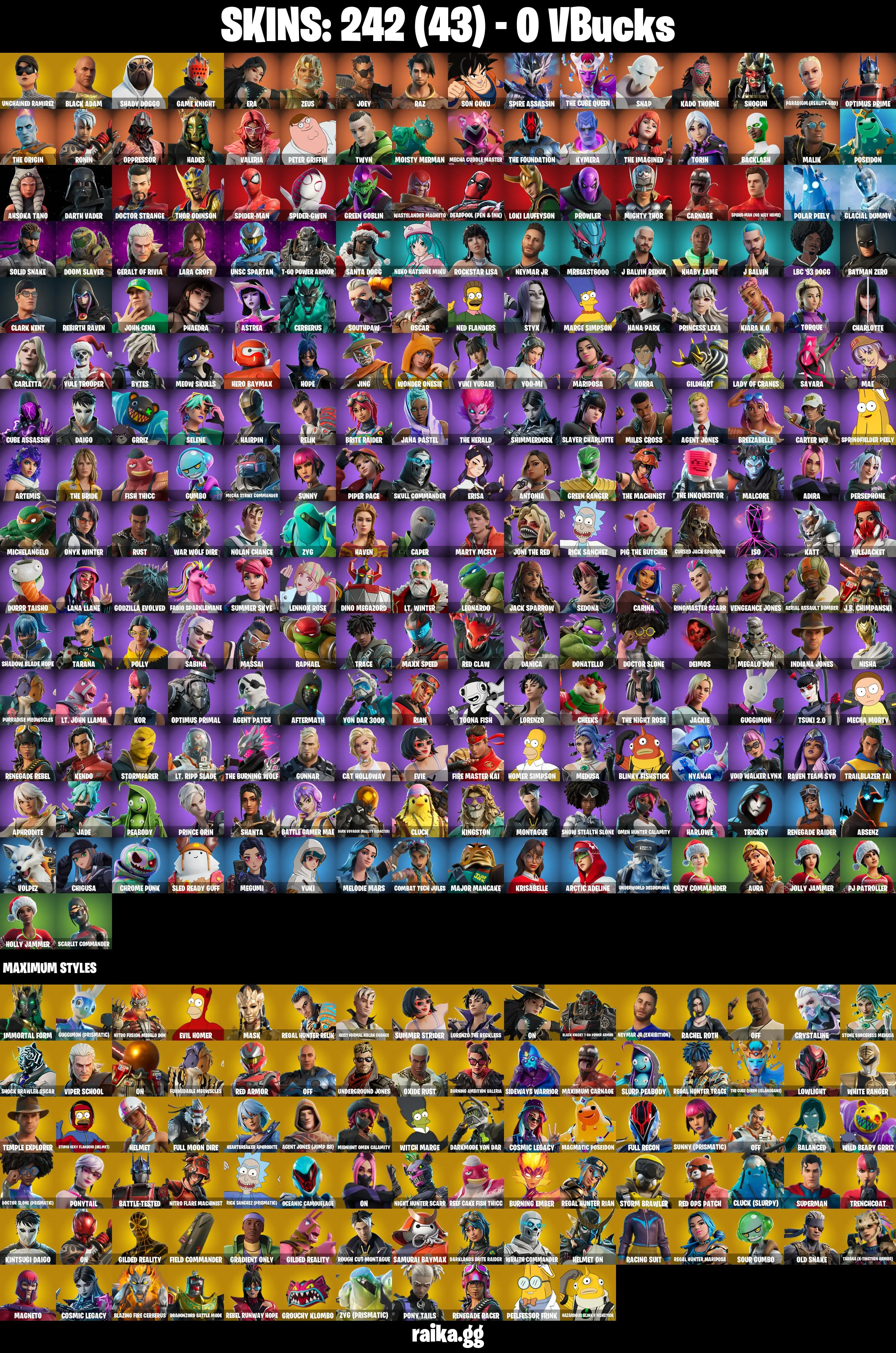 (PC/PSN/XBOX) 0 VB) 242 SKINS 🎰 Renegade Raider 🎰 Unchained Ramirez 🎰 Black Adam 🎰 Shady Doggo 🎰 Game Knight 🎰 Era 🎰 Zeus 🎰 Joey 🎰 Raz 🎰 PARENTAL CONTROL