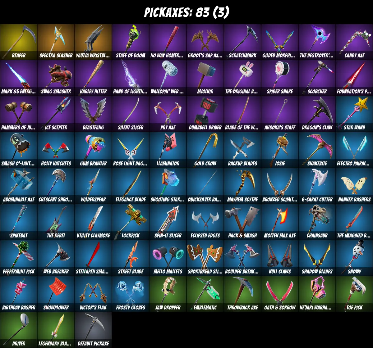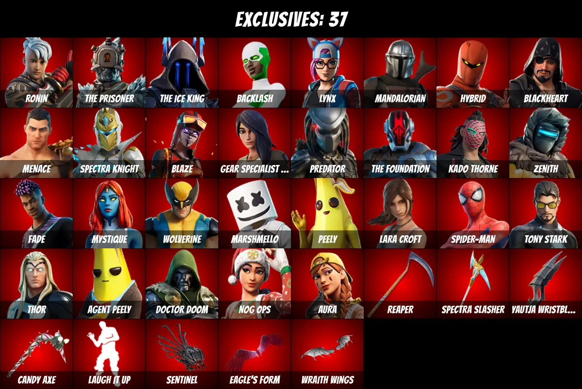 ⚡PC/PSN/XBOX⚡ 103 skins 💎 Candy Axe 💎 Backlash 💎 Tony Stark 💎 Lara Croft 💎 Mandalorian 💎 Spider-Man (No Way Home) 💎 Lynx 💎 Blaze 💎 Aura 💎 Peely 💎 Agent Peely 💎 Spider-Man 💎 Siren 💎 Thor 💎 Laugh It Up 💎 Crystal 💎 Ronin 💎 The Prisoner 💎 1350 V-Bucks 💎
