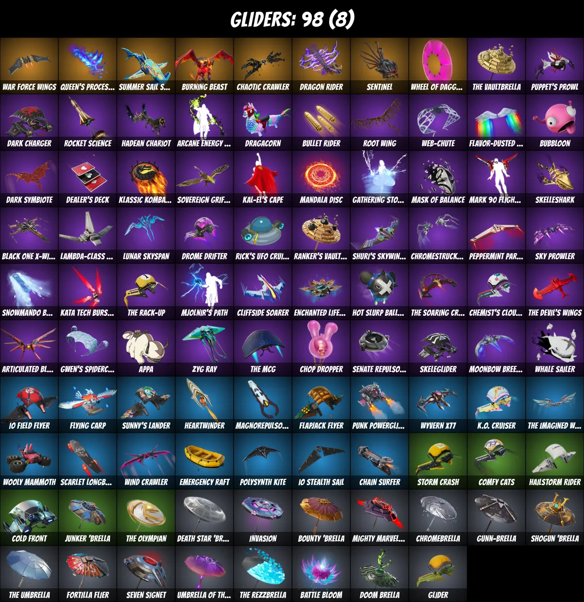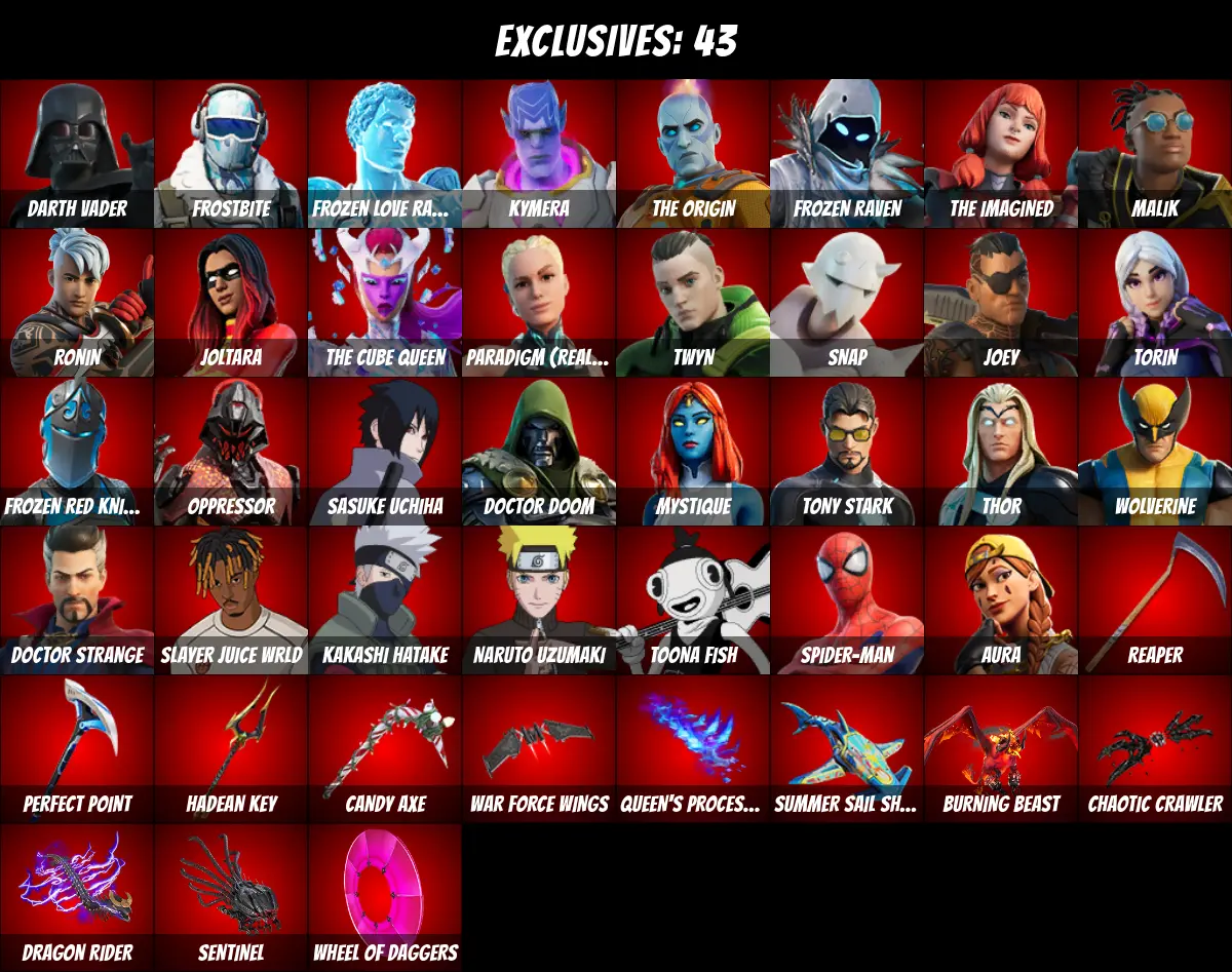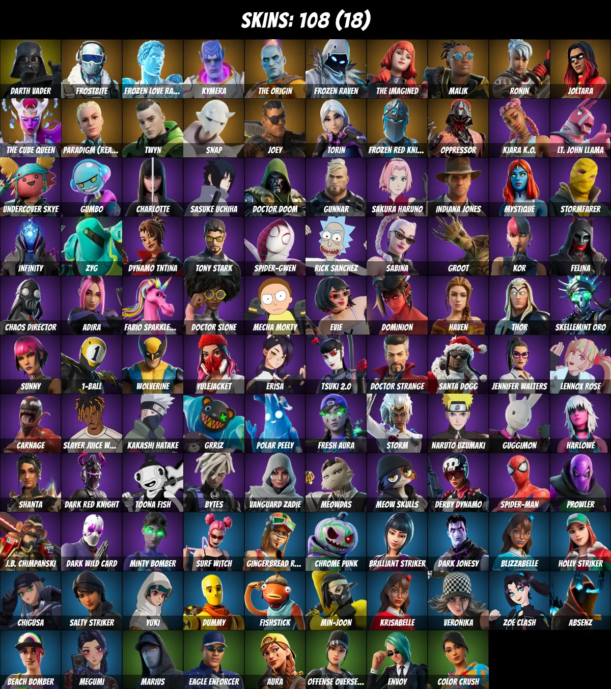 ⚡PC/PSN/XBOX⚡ 108 skins 💎 Naruto Uzumaki 💎 Candy Axe 💎 Rick Sanchez 💎 Kor 💎 Tony Stark 💎 Surf Witch 💎 Joltara 💎 Spider-Gwen 💎 Darth Vader 💎 Fishstick 💎 Aura 💎 Spider-Man 💎 Kakashi Hatake 💎 Sasuke Uchiha 💎 Toona Fish 💎 Frostbite 💎 850 V-Bucks 💎
