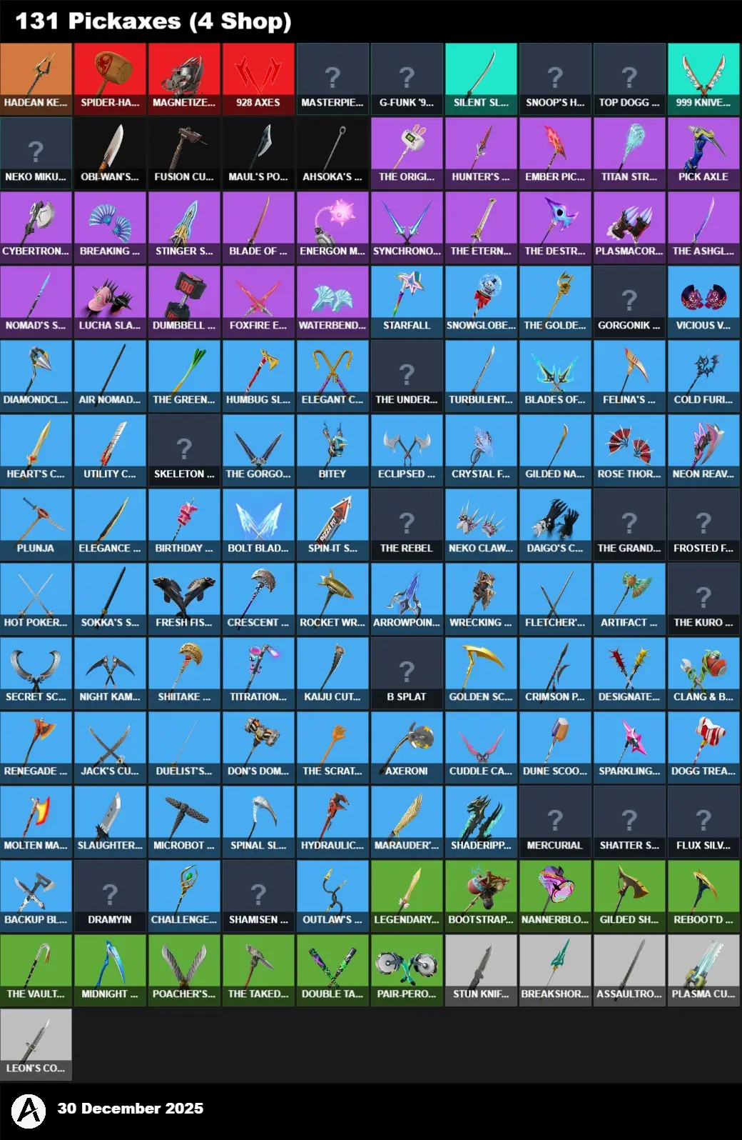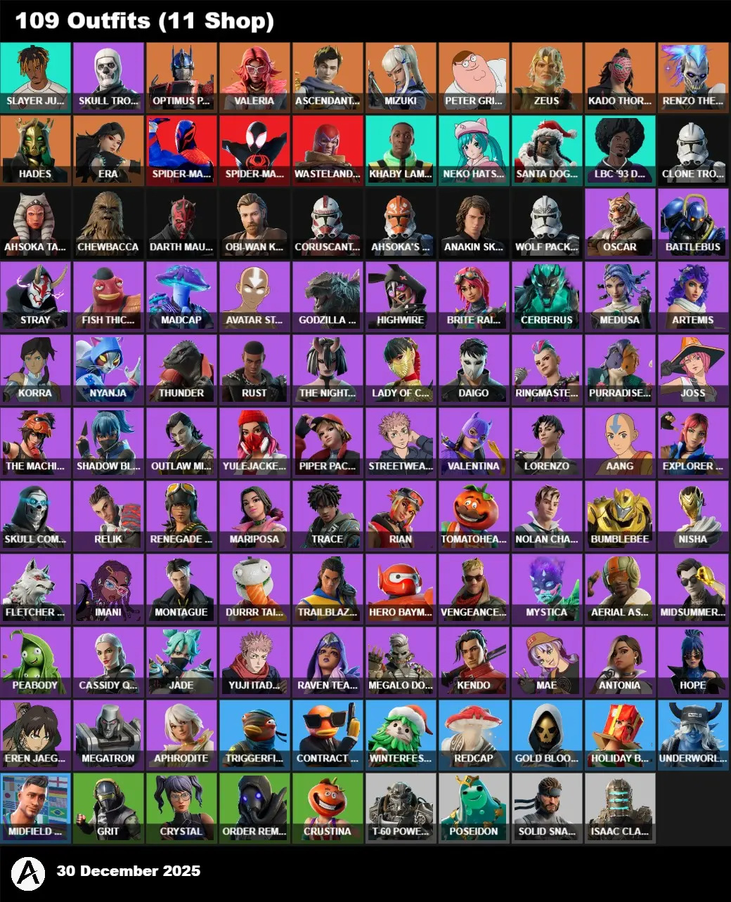 | PC/PSN/XBOX | 109 Skins | Juice WRLD | Skull Trooper | Khaby Lame | Neko Hatsune Miku | Santa Dogg | LBC '93 Dogg | Optimus Prime | Valeria | Ascendant Midas | Mizuki | Peter Griffin | Zeus