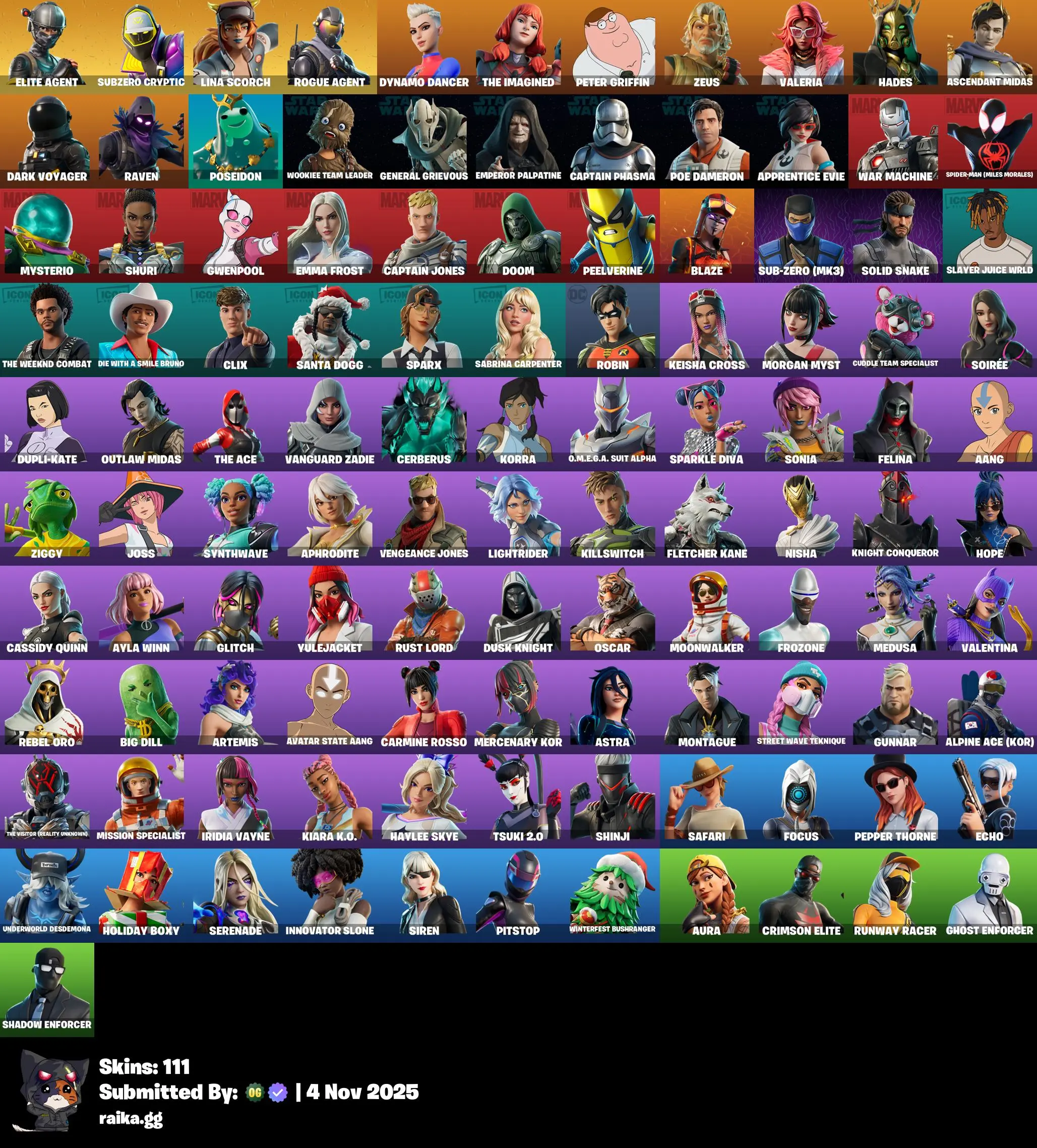 [PC/PSN/XBOX] 111 skins | Elite Agent | Take The L | Subzero Cryptic | Lina Scorch | Rogue Agent | Dynamo Dancer | The Imagined | Peter Griffin | Zeus | Valeria | Hades | 200 VB