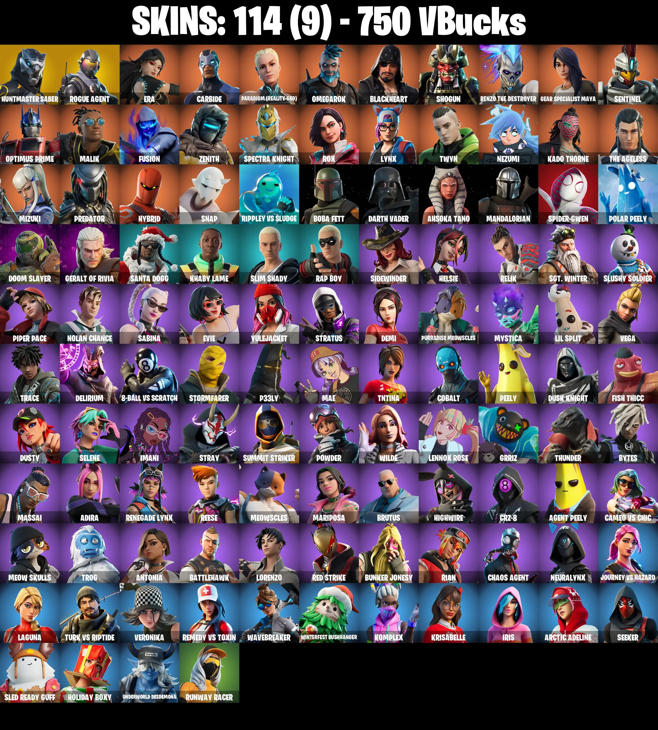 PC/PSN/XBOX ♨️114 skins ✨ Huntmaster Saber ✨ Spider-Gwen ✨ Rogue Agent ✨ Carbide ✨ Peely ✨ Fusion ✨ Darth Vader ✨ The Ageless ✨ Mizuki ✨ #B848