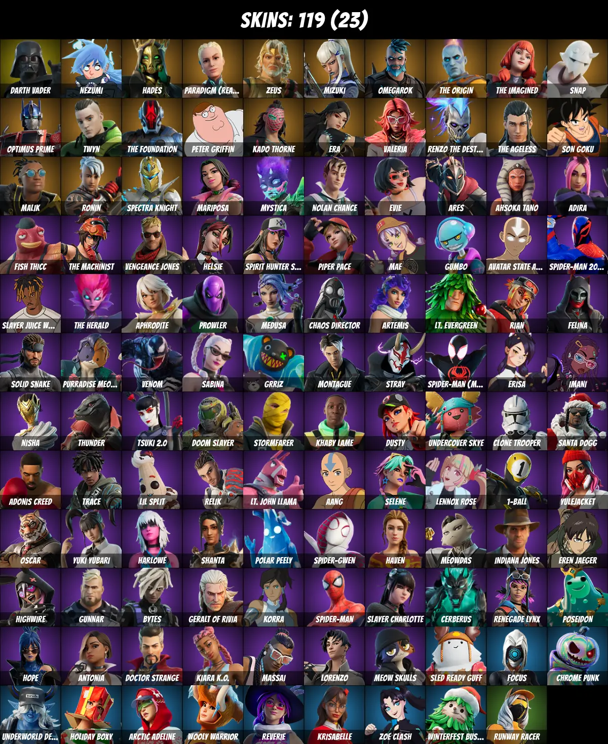 ⚡PC/PSN/XBOX⚡ 119 skins 💎 Spider-Man (Miles Morales) 💎 Spider-Gwen 💎 Darth Vader 💎 Spider-Man 💎 Focus 💎 Son Goku 💎 The Ageless 💎 Venom 💎 Renzo the Destroyer 💎 Zeus 💎 Hades 💎 Snap 💎 Peter Griffin 💎 Doctor Strange 💎 Nezumi 💎 900 V-Bucks 💎