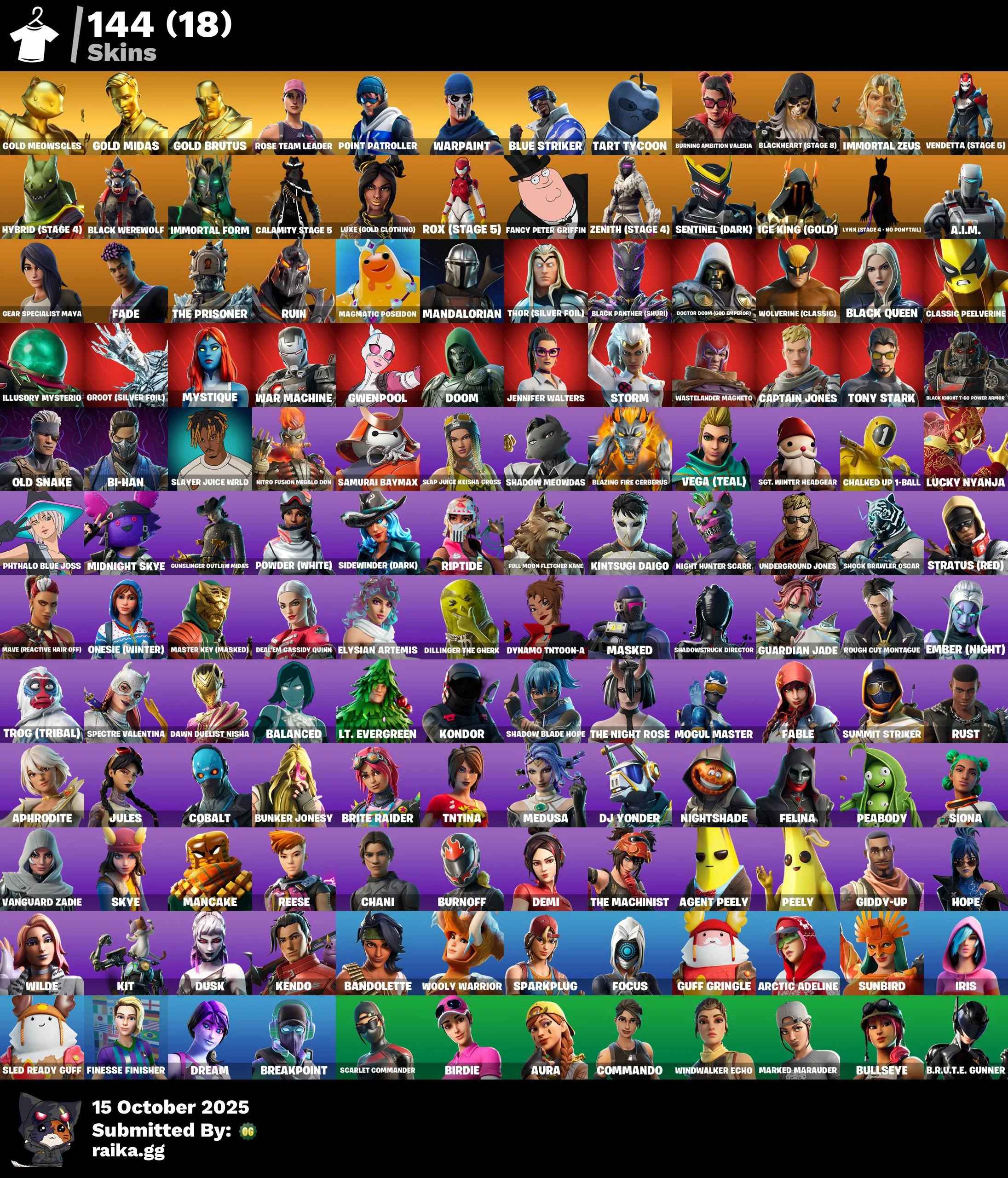 [PC/PSN/XBOX] 144 skins | OG STW | Chani | Merry Mint Axe | Jules | Aura | Tony Stark | Peely | Mystique | Star Wand mssh724