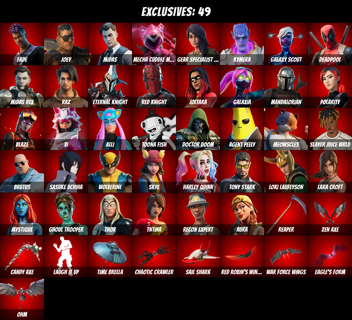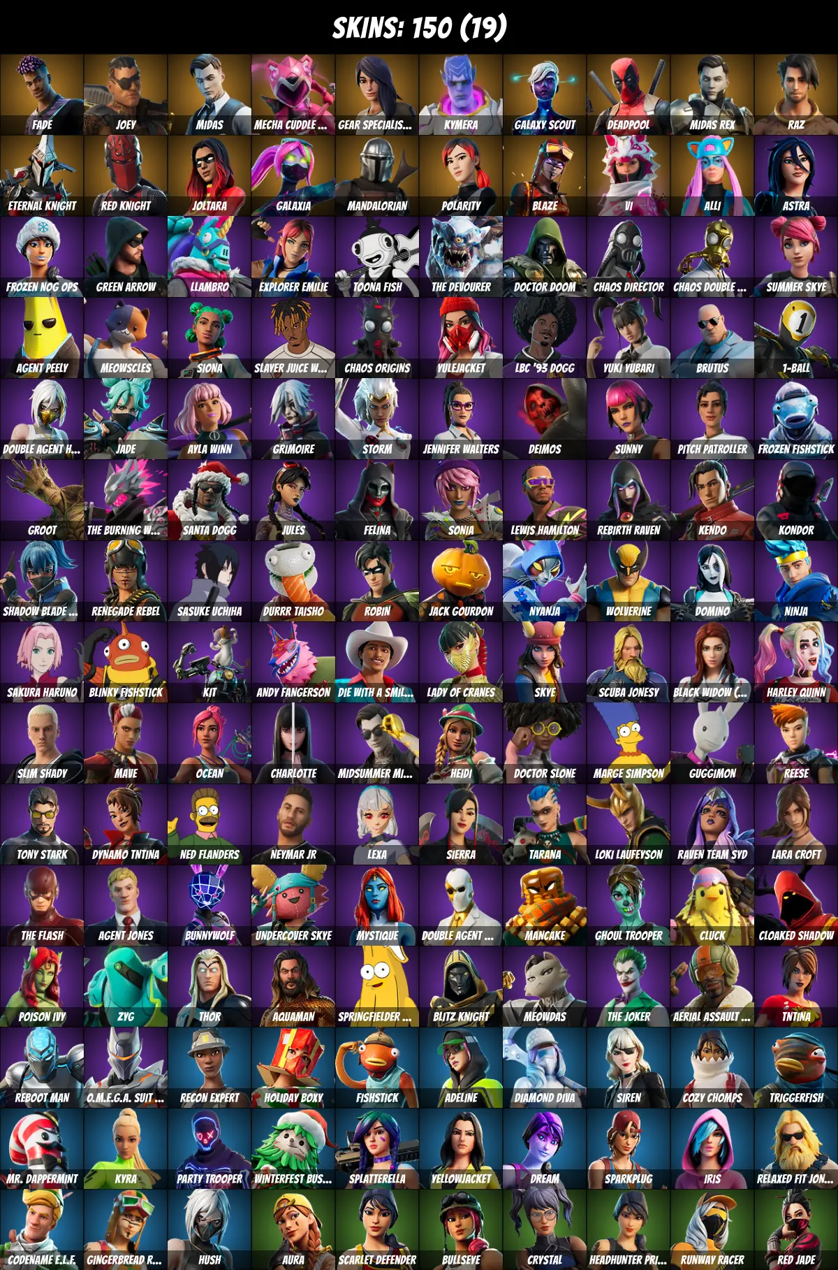 ⚡PC/PSN/XBOX⚡ 150 skins 💎 Ghoul Trooper 💎 Candy Axe 💎 Deadpool 💎 Harley Quinn 💎 Tony Stark 💎 Lara Croft 💎 Midas 💎 Vi 💎 Joltara 💎 Galaxia 💎 Mandalorian 💎 Jules 💎 Blaze 💎 Fishstick 💎 Aura 💎 Agent Peely 💎 Sasuke Uchiha 💎 Fade 💎 Joey 💎 1400 V-Bucks 💎