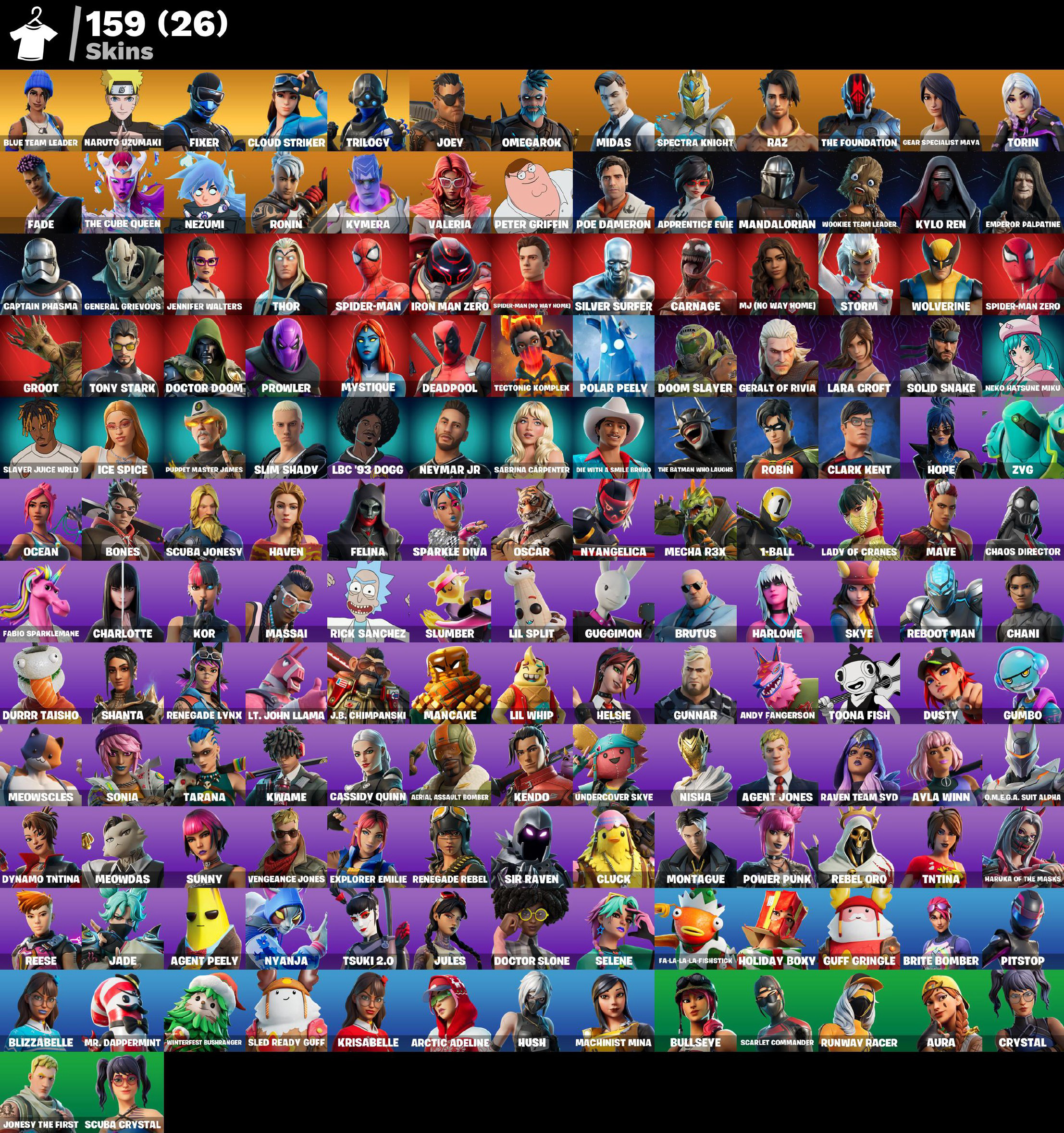 PC,PSN,XBOX 159 SKINS FA ⸱ CHANI ⸱ MANDALORIAN ⸱ KYLO REN ⸱ WOOKIE TEAM LEADER ⸱ SLIM SHADY ⸱ SILVER SURFER ⸱ ICE SPICE ⸱ MAKO RK027