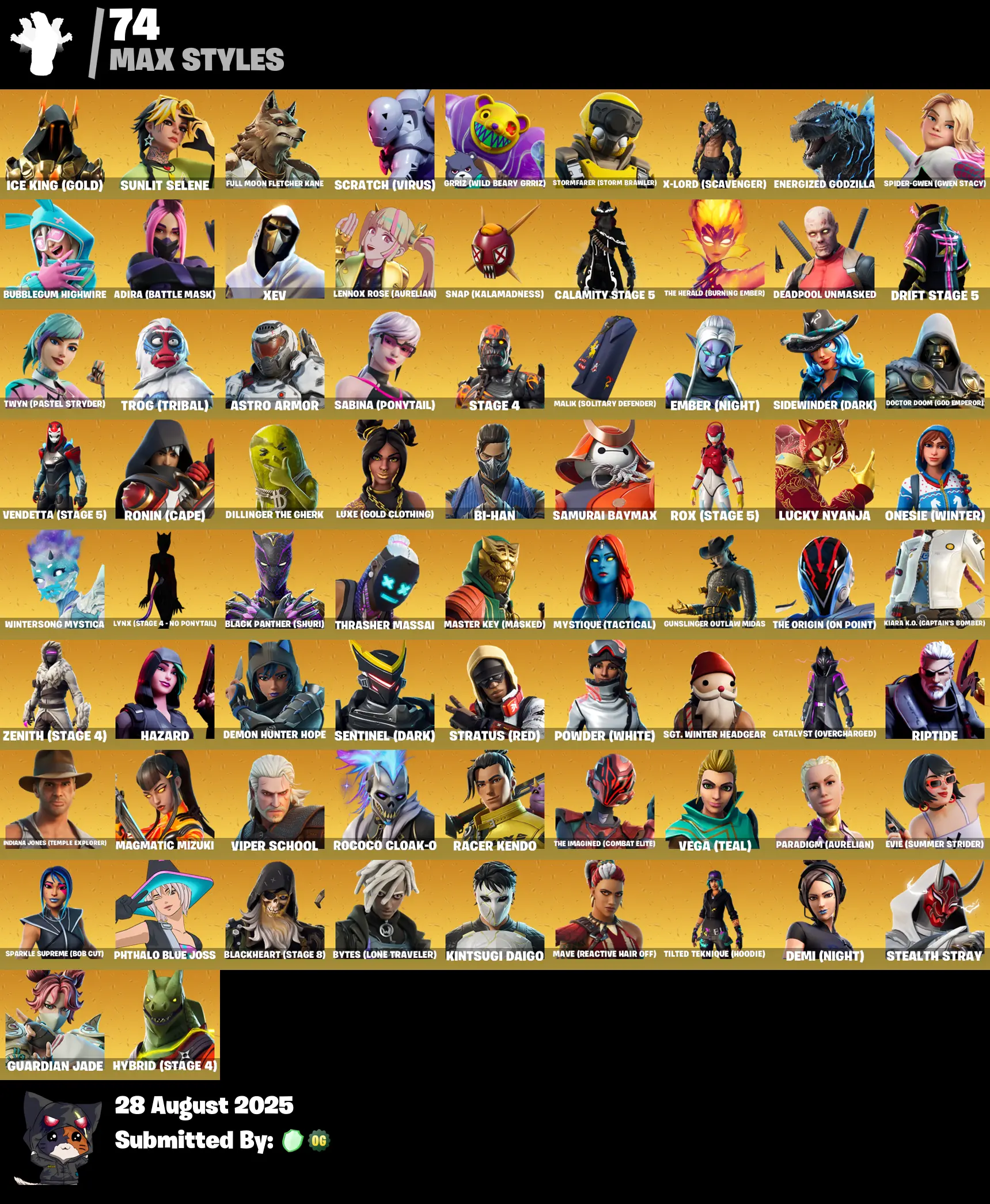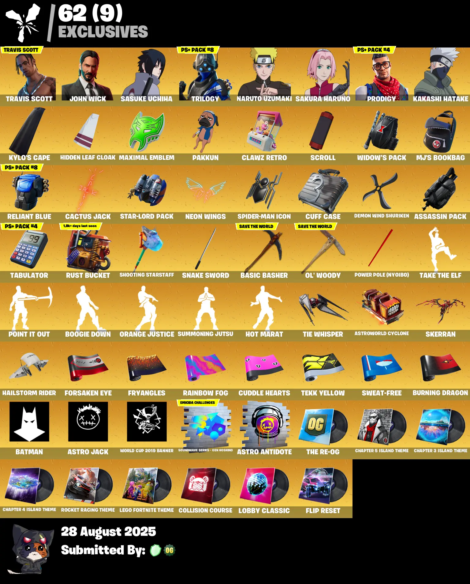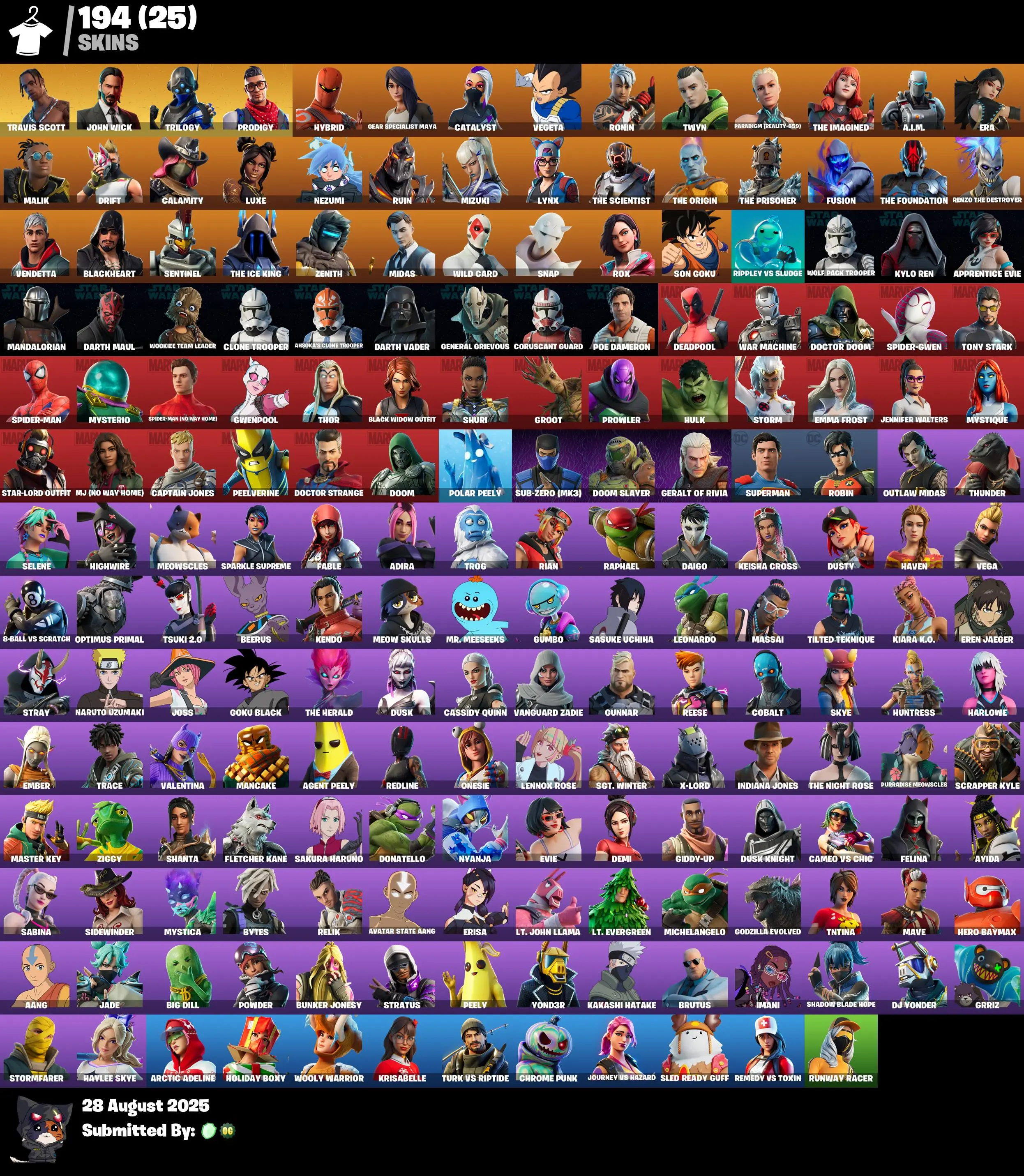๐ [PC/PSN/XBOX] 194 SKINS | TRAVIS SCOTT, JOHN WICK, SAKURA HARUNO, SNAKE SWORD, SUMMONING JUTSU, SNAP, MAGMATIC MIZUKI, RACER KENDO, DEMI, INDIANA JONES, BI-HAN, DOCTOR DOOM, SPIDER-GWEN, LUNAR PARTY, GENERAL GRIVIOUS, HULK, SUPERMAN