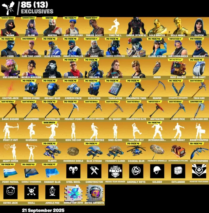 [PC/PSN/XBOX] 222 skins ✨ OG STW ✨ IKONIK ✨ Glow ✨ Leviathan Axe ✨ Blue Team Leader ✨ Travis Scott ✨ Omega (stage 5) ✨