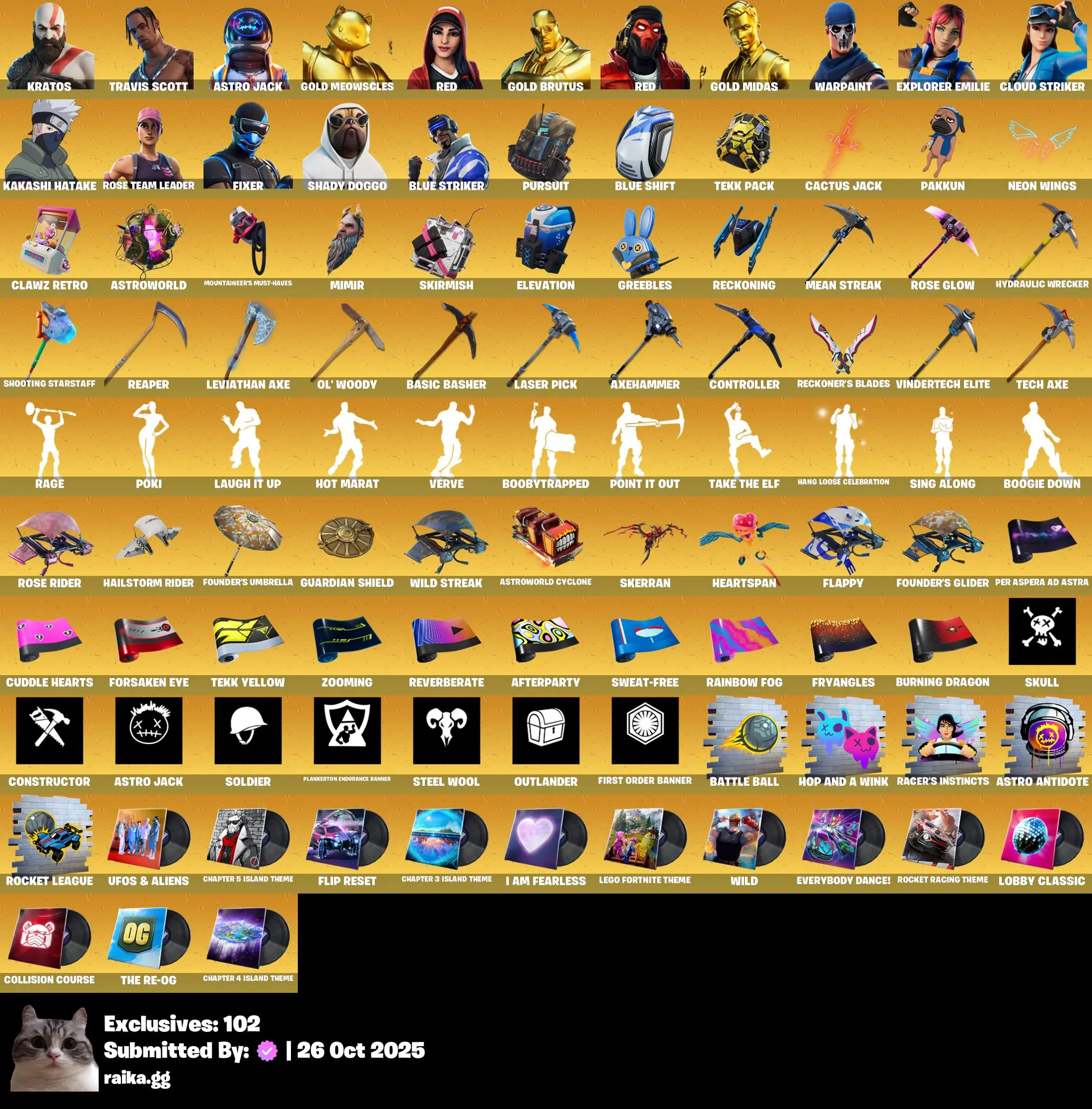 [PC/PSN/XBOX] 257 skins | OG STW | Kratos | Travis Scott | Leviathan Axe | Astro Jack | Gold Meowscles | Gold Brutus | Gold Midas | Explorer Emilie | Cloud Striker |