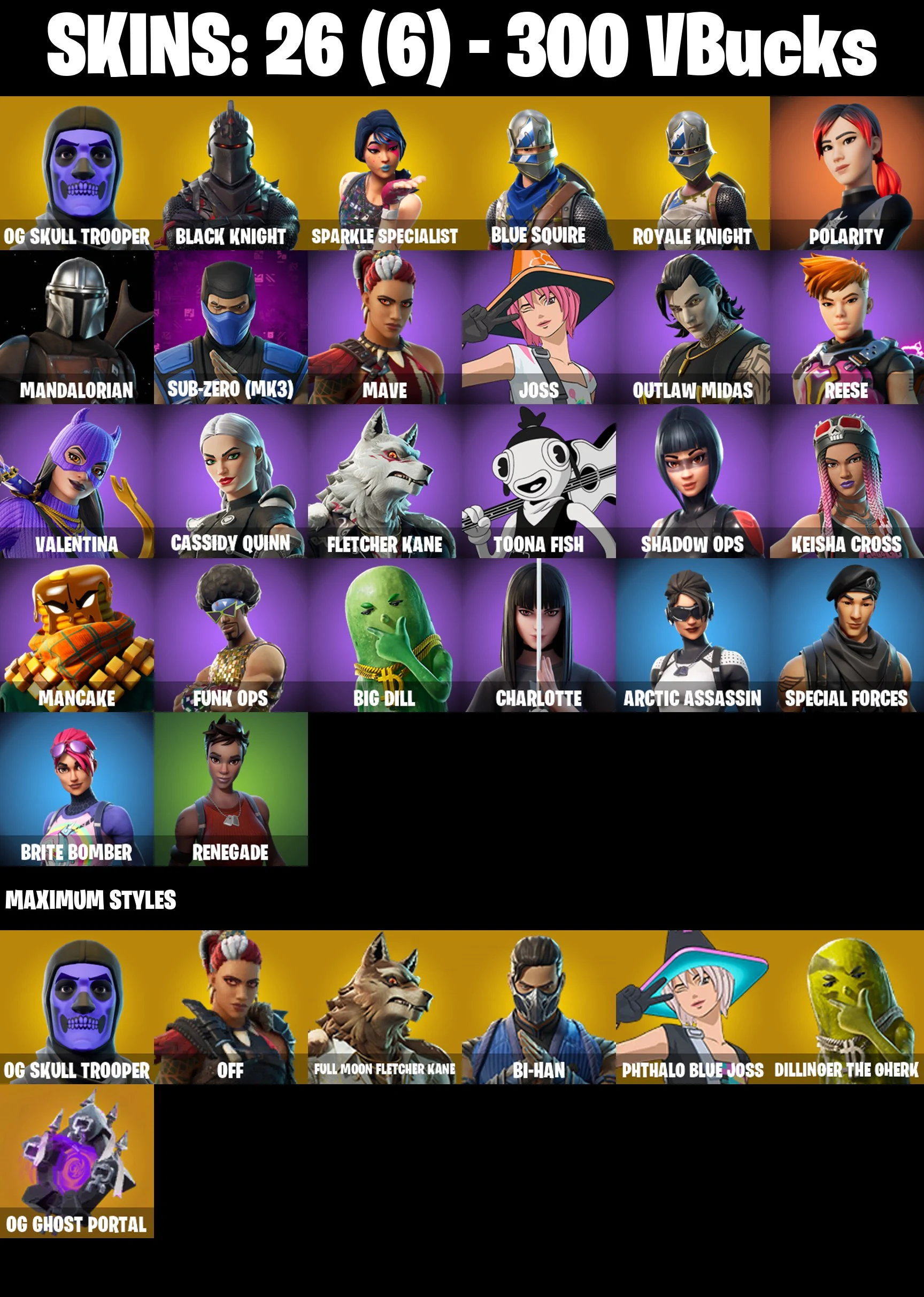 (PC/PSN/XBOX) 26 SKINS 💚 OG Skull Trooper 💚 Black Knight 💚 Sparkle Specialist 💚 Blue Squire 💚 Royale Knight 💚 Polarity 💚 300 VB 💚