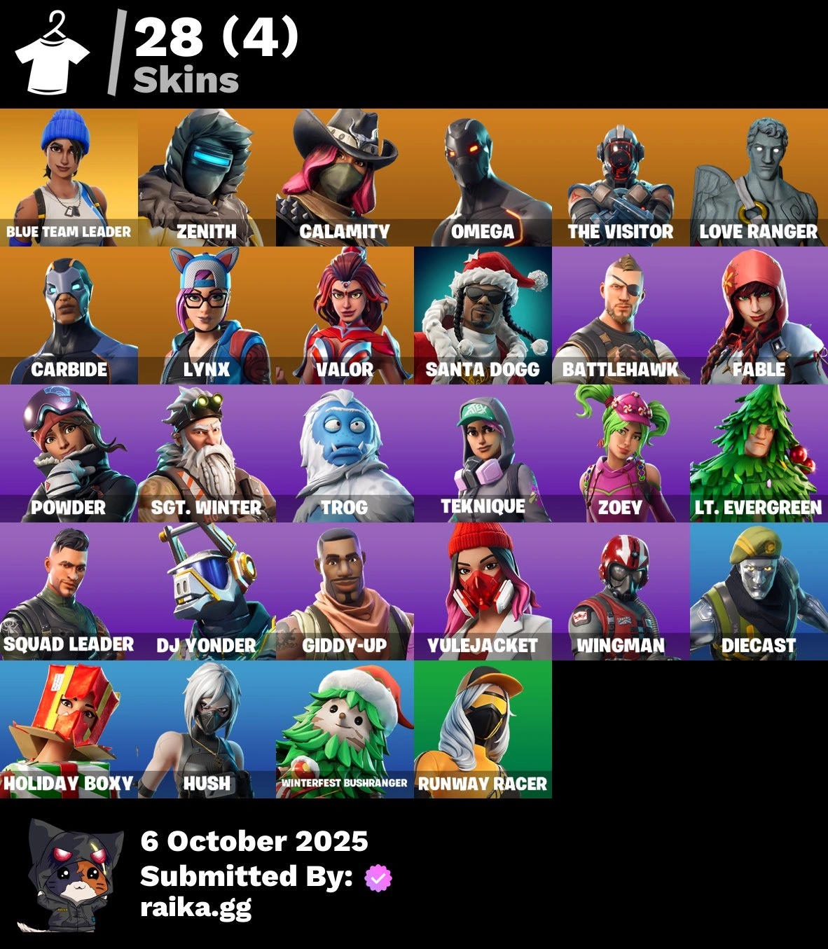 [PC/PSN/XBOX] 28 skins | Blue Team Leader | Zenith | Calamity | Omega | The Visitor | Love Ranger | Carbide | Lynx | Valor | Santa Dogg | Battlehawk | Fable | 0 VB