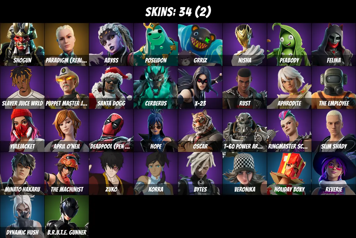 ⚡PC/PSN/XBOX⚡ 34 skins 💎 Poseidon 💎 Slayer Juice Wrld 💎 Paradigm (Reality-659) 💎 Shogun 💎 War Force Wings 💎 Abyss 💎 Grriz 💎 Nisha 💎 Peabody 💎 Felina 💎 Puppet Master James 💎 Santa Dogg 💎 Cerberus 💎 X-23 💎 Rust 💎 Aphrodite 💎 The Employee 💎 1100 V-Bucks 💎