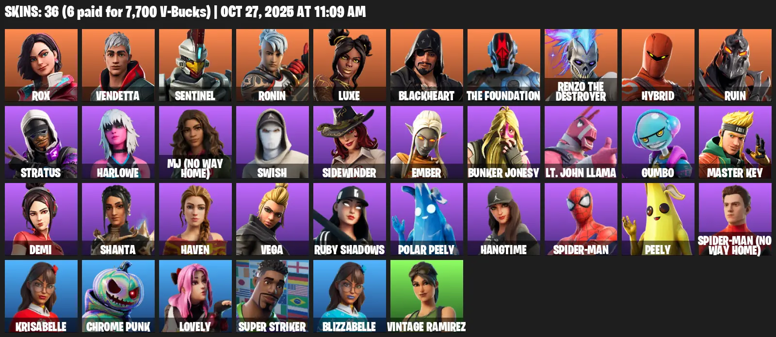 [PC/PSN/XBOX] | 36 skins | Rox | Vendetta | Sentinel | Ronin | Luxe | Blackheart | The Foundation | Renzo the Destroyer | Hybrid | #TNM7878 | #MBFN