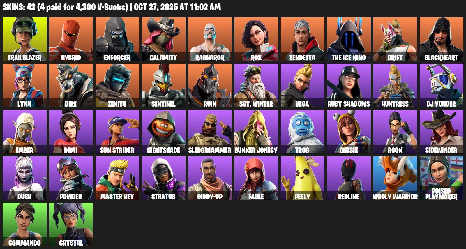 [PC/PSN/XBOX] | 42 skins | 800 V-bucks | Trailblazer | Hybrid | Enforcer | Calamity | Ragnarok | Rox | Vendetta | The Ice King | #GCM5791 | #MBFN