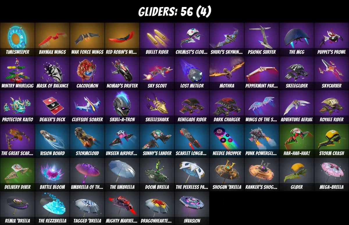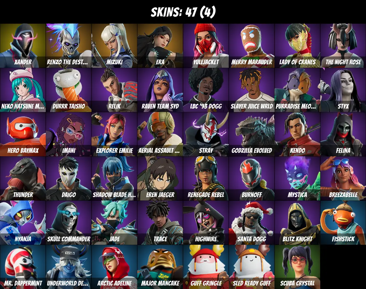 ⚡PC/PSN/XBOX⚡ 47 skins 💎 Fishstick 💎 Renzo the Destroyer 💎 Eren Jaeger 💎 Slayer Juice Wrld 💎 Mizuki 💎 Era 💎 Xander 💎 Red Robin's Wings 💎 Baymax Wings 💎 Timesweeper 💎 War Force Wings 💎 Yulejacket 💎 Merry Marauder 💎 Lady of Cranes 💎 100 V-Bucks 💎