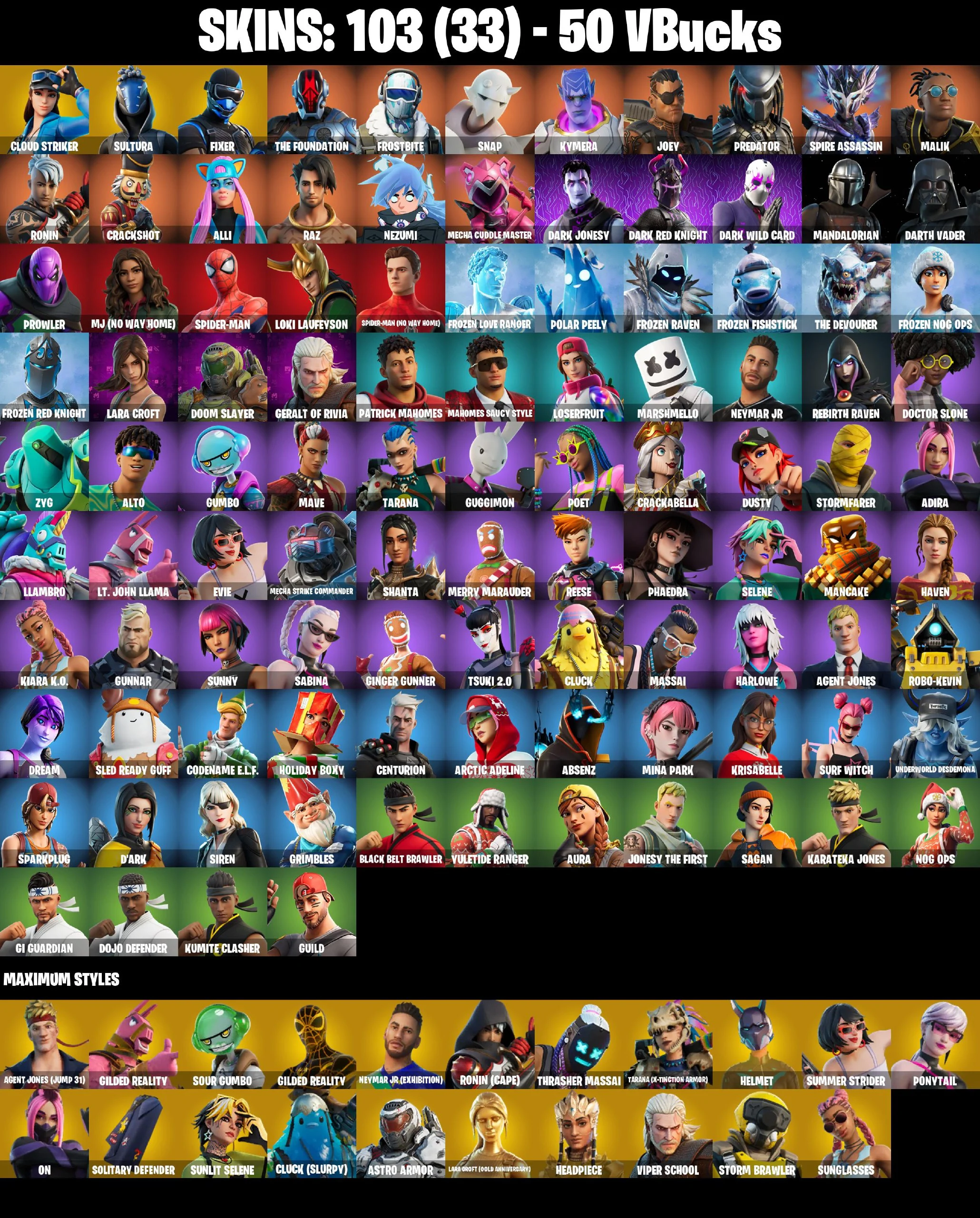 (PC/PSN/XBOX) 50 VB) 103 skins | Cloud Striker | Sultura | Fixer | The Foundation | Frostbite | Snap | Kymera | Joey | Predator | Spire Assassin