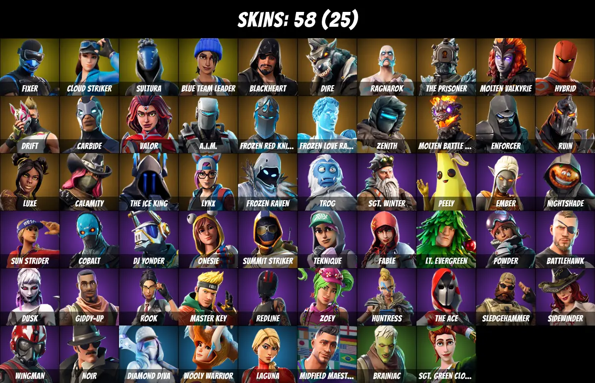 ⚡PC/PSN/XBOX⚡ 58 skins 💎 Drift 💎 Lynx 💎 Peely 💎 Calamity 💎 Blue Team Leader 💎 Orange Justice 💎 Molten Battle Hound 💎 Valor 💎 Zenith 💎 Enforcer 💎 Frozen Red Knight 💎 Ruin 💎 Fixer 💎 Molten Valkyrie 💎 Luxe 💎 Ragnarok 💎 Cloud Striker 💎 Sultura 💎 600 V-Bucks 💎