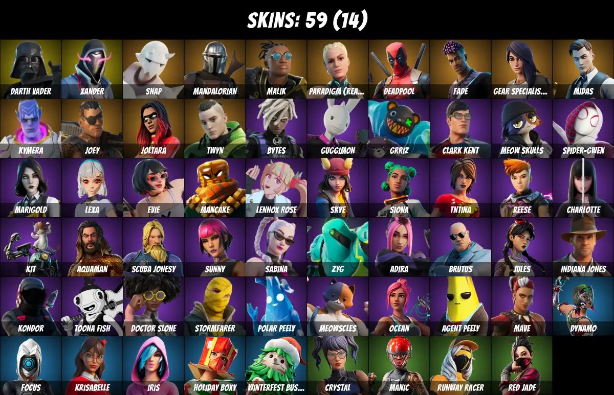 ⚡PC/PSN/XBOX⚡ 59 skins 💎 Deadpool 💎 Midas 💎 Joltara 💎 Mandalorian 💎 Spider-Gwen 💎 Darth Vader 💎 Jules 💎 Agent Peely 💎 Focus 💎 Toona Fish 💎 Meowscles 💎 Crystal 💎 Snap 💎 TNTina 💎 Brutus 💎 Manic 💎 Dynamo 💎 Skye 💎 Xander 💎 Malik 💎 400 V-Bucks 💎