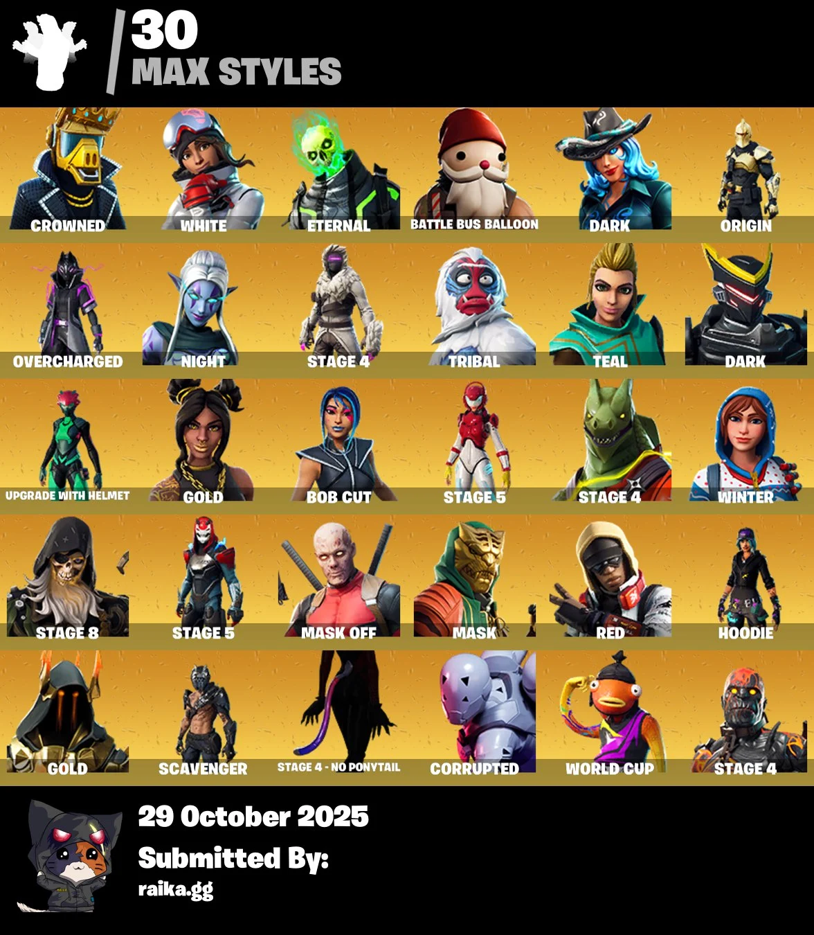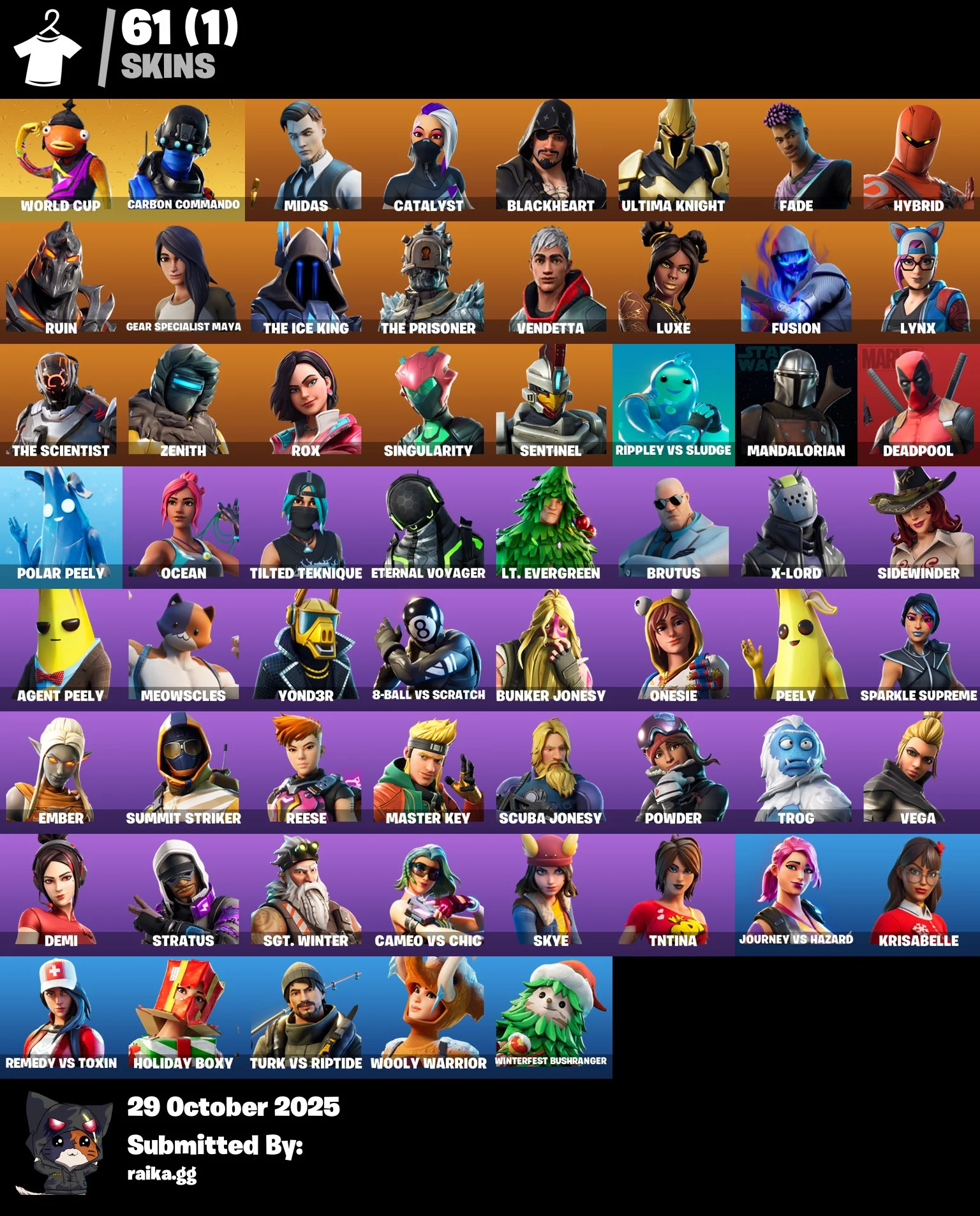 [PC/PSN/XBOX] 61 skins | WORLD CUP | Carbon Commando | Midas | Catalyst | Blackheart | Ultima Knight | Fade | Hybrid | Ruin | Gear Specialist Maya | 1500 VB