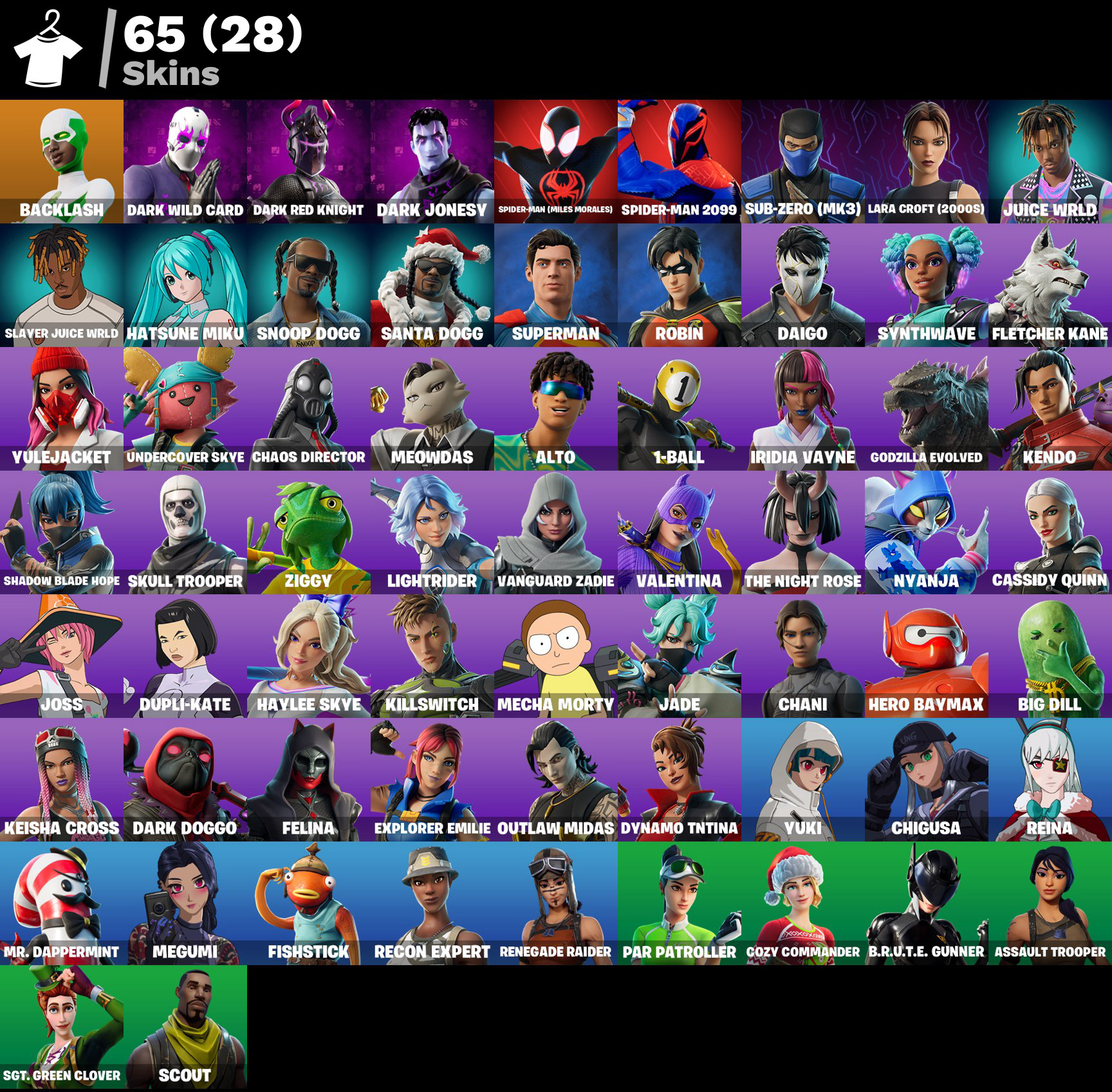 PC,PSN,XBOX 65 SKINS FA ⸱ BACKLASH ⸱ SCOUT ⸱ MIKU ⸱ SPIDER MAN ⸱ JUICE WRLD ⸱ CHANI ⸱ LARA CROFT ⸱ SUPERMAN ⸱ SKULL TROOPER ⸱ RENEGADE RAIDER RK071
