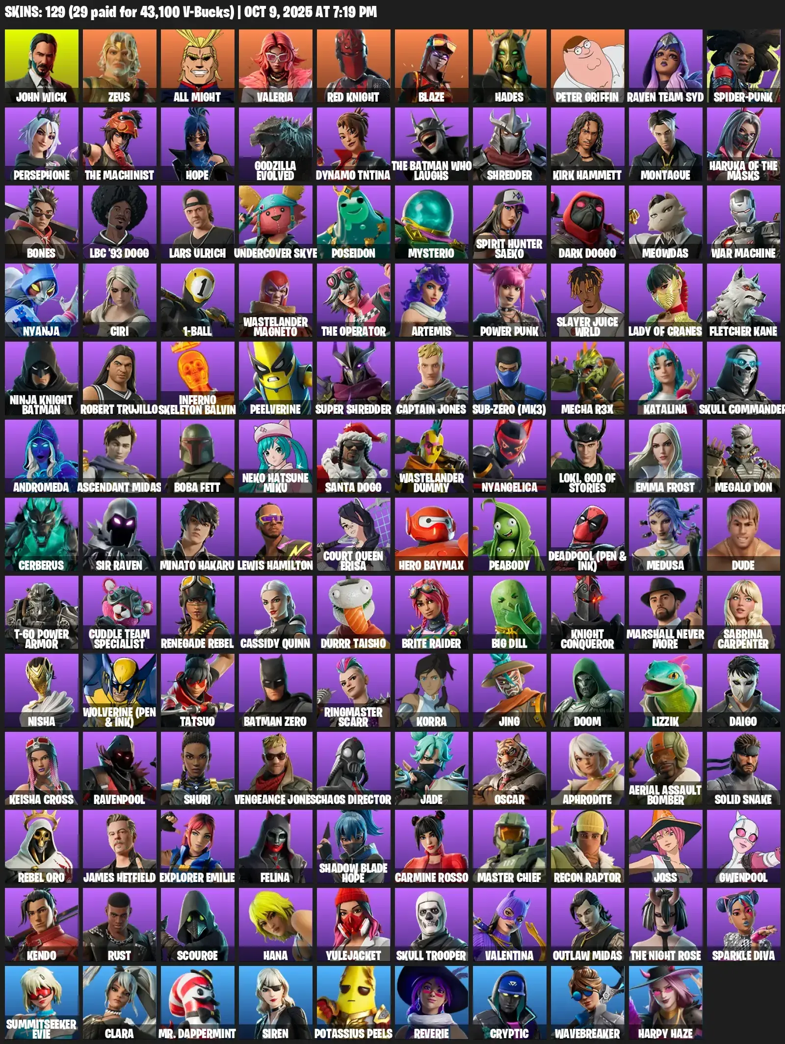 [PC/PSN/XBOX] | 129 skins | 500 V-bucks | Raider's Revenge | John Wick | Zeus | All Might | Valeria | Red Knight | Blaze | Hades | #IXH8391 | #MBFN