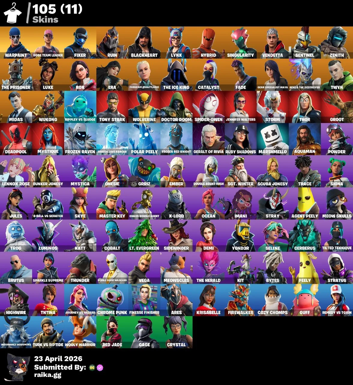 [PC/PSN/XBOX/Nintendo] 105 skins F/A : Leviathan Axe | OG STW | Fixer | Twyn | Renzo the Destroyer | Rox | Wukong | Gear Specialist Maya | Hybrid | Midas | Vendetta | Ruin | The Prisoner