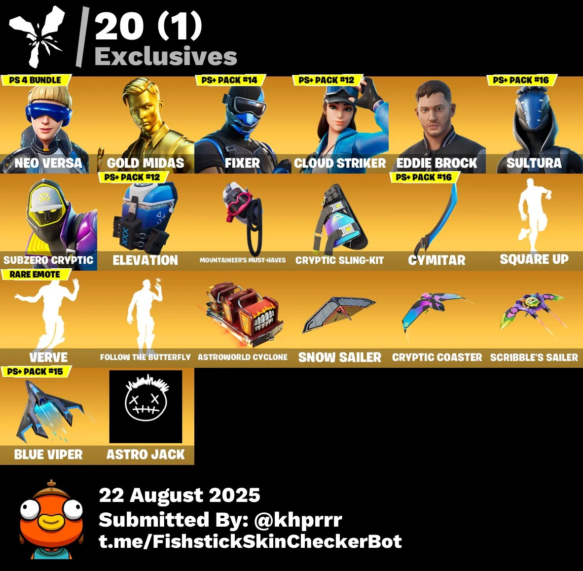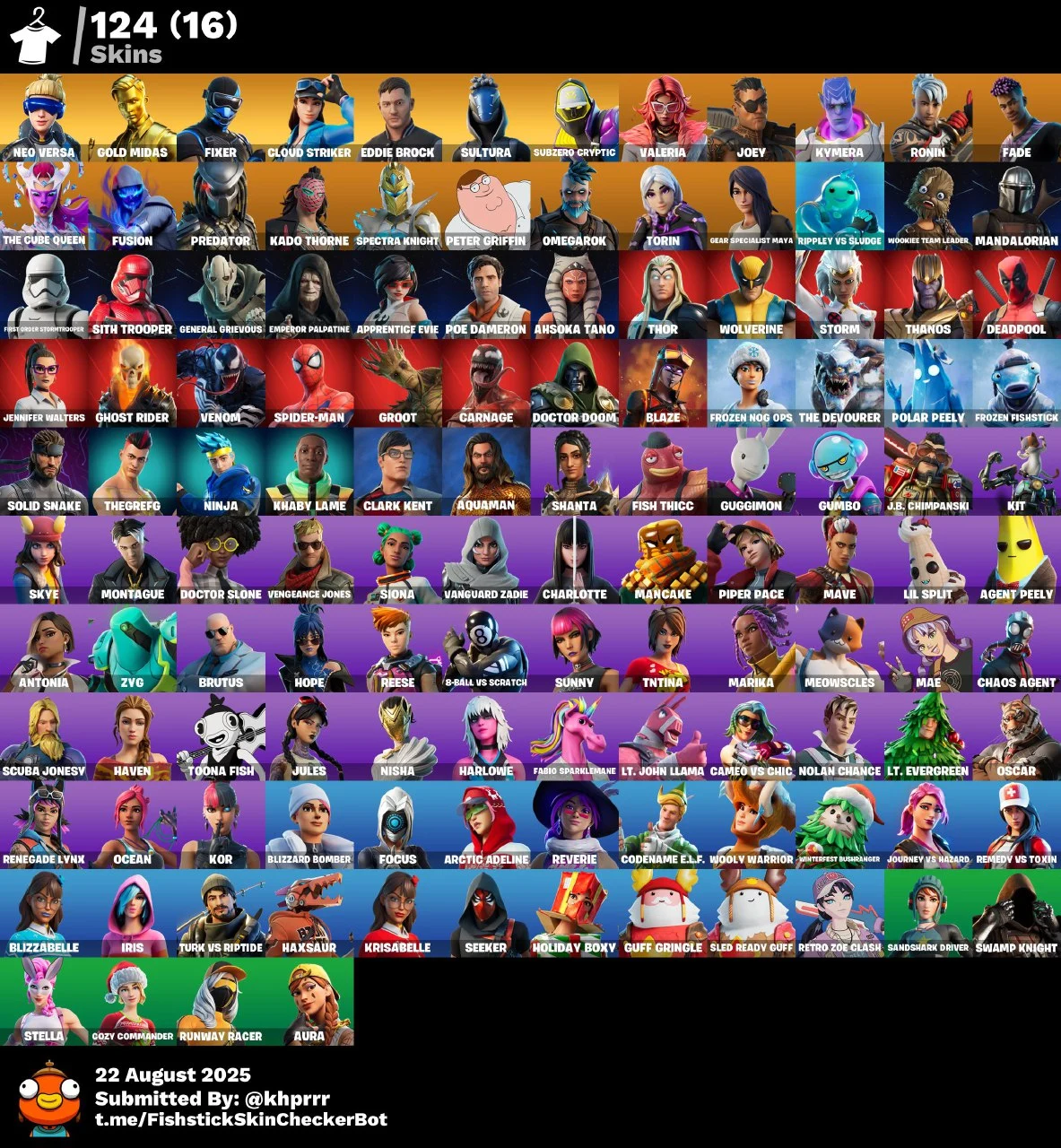 [PC/PSN/XBOX/Nintendo] 124 skins F/A : Eddie Brock | Venom | Neo Versa | Gold Midas | Fixer | Cloud Striker | Sultura | Subzero Cryptic | Elevation | Mountaineer's Must-Haves