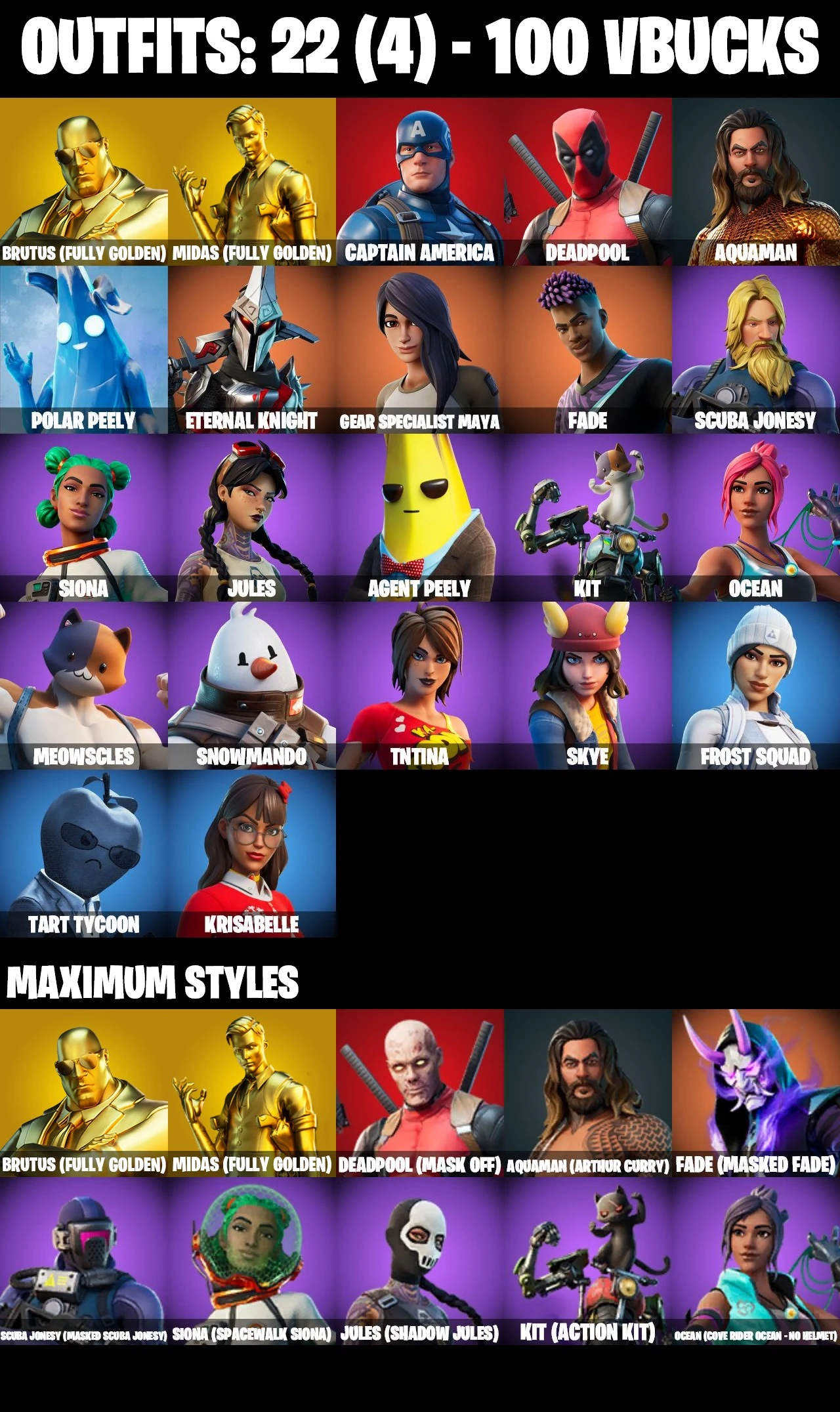 PC/PSN/XBOX/NINTENDO⚡ 22 SKINS MIDAS GOLD ❤️ BRUTUS GOLD ❤️ CAPTAIN AMERICA ❤️ DEADPOOL ❤️ AQUAMAN ❤️ SHADOW JULES ❤️ FADE MAX ❤️ POLAR PEELY ⚡FULL ACCESS