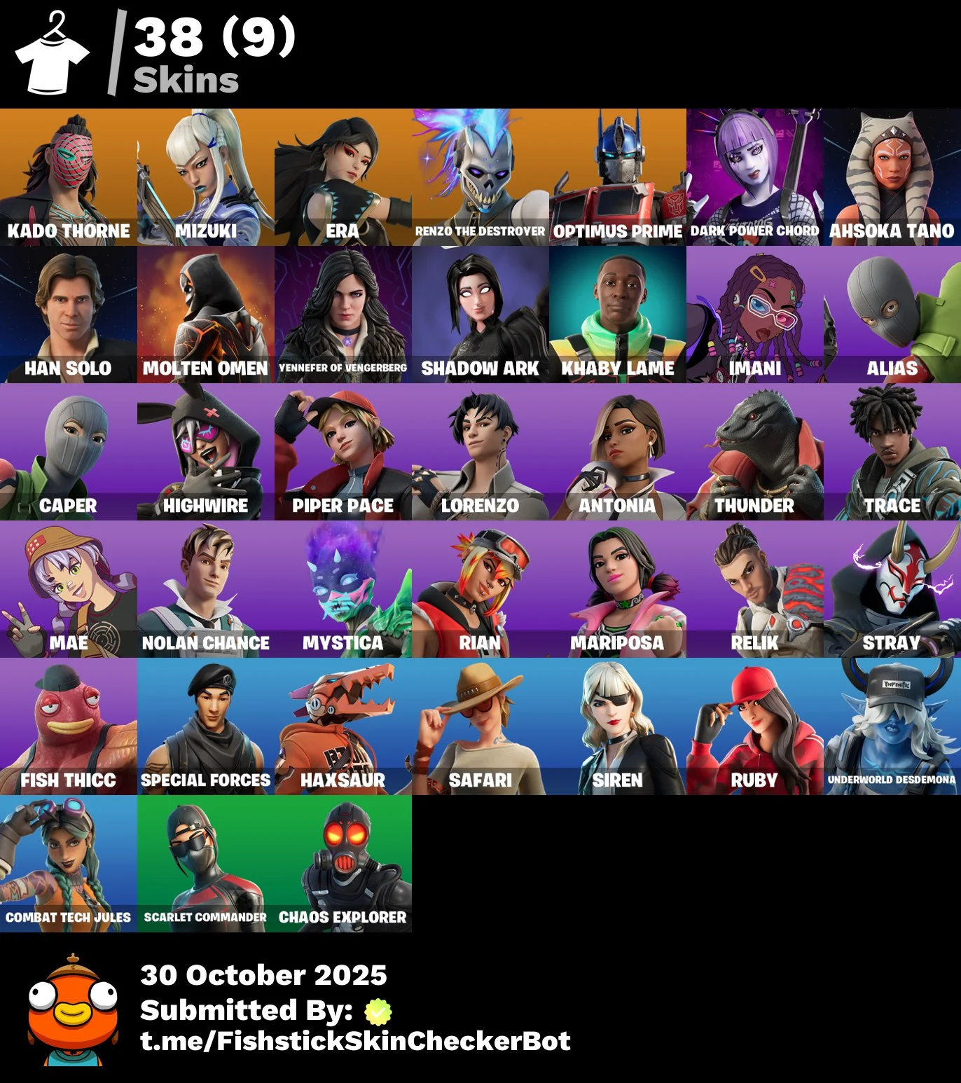 [PC/PSN/XBOX/NINTENDO] 38 skins | Special Forces |  Kado Thorne | Mizuki | Era | Renzo the Destroyer | Optimus Prime | Dark Power Chord | Ahsoka Tano | Han Solo | Molten Omen | 150 VB