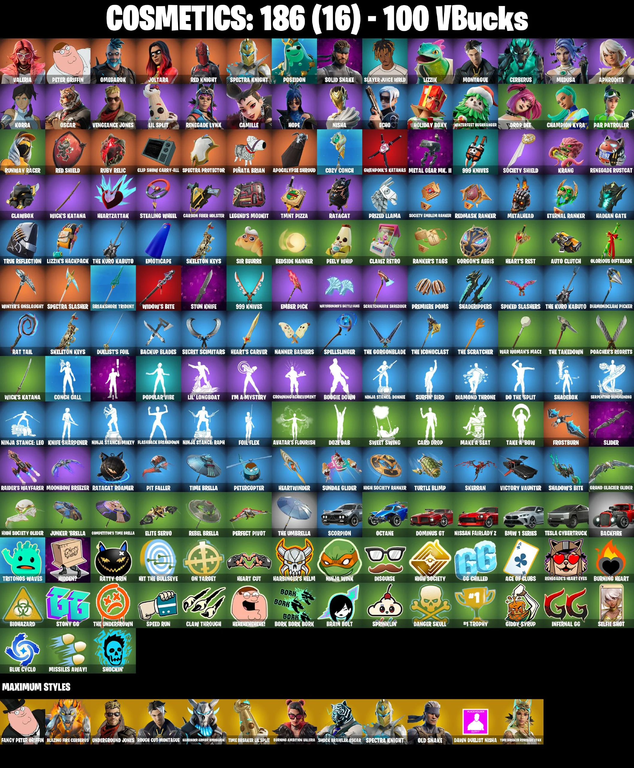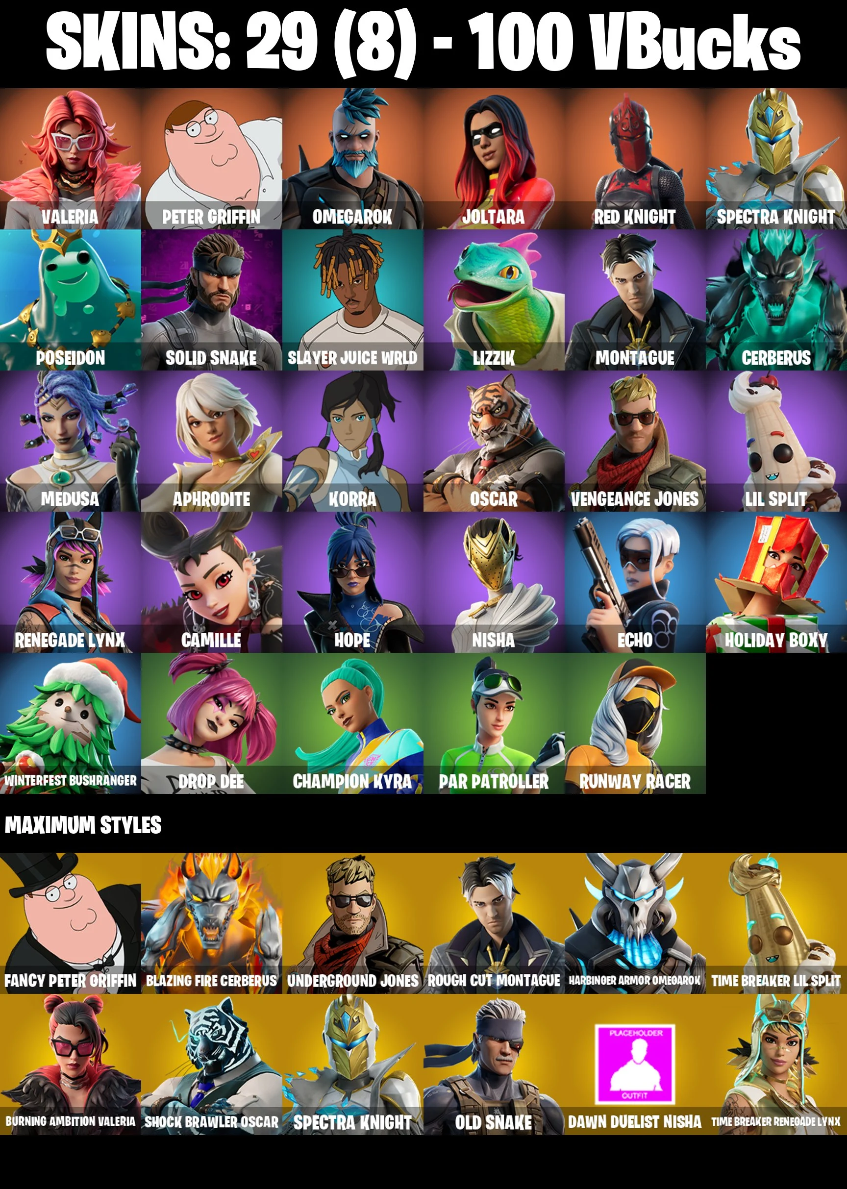 ⭐ [PC/PSN/XBOX/NINTENDO/MOBILE] 29 SKINS | JOLTARA | RED KNIGHT | VALERIA | OMEGAROK | SPECTRA KNIGHT | PETER GRIFFIN | SOLID SNAKE | OSCAR | SLAYER JUICE WRLD | ECHO | CAMILLE | NISHA | RENEGADE LYNX | CHAMPION KYRA | DROP DEE | 100 VBUCKS | EMAIL