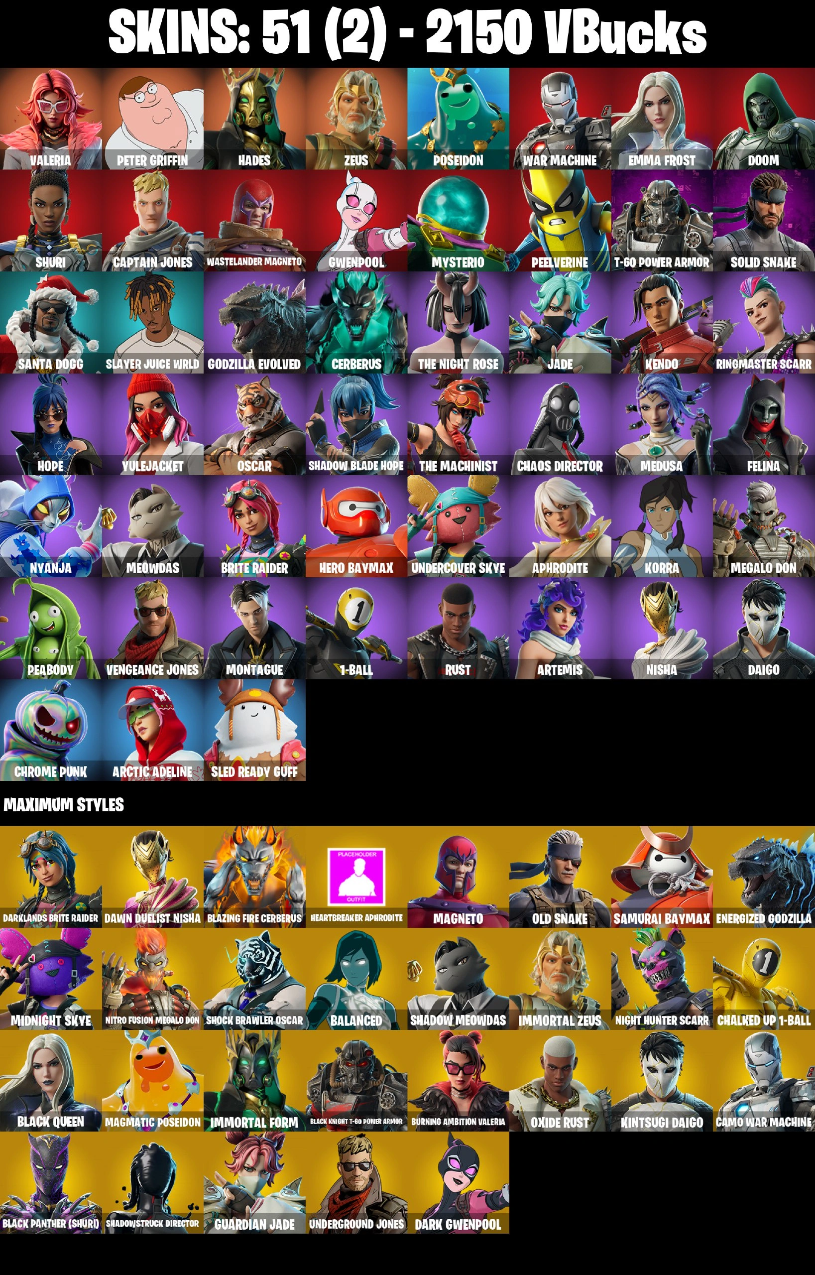 β[PC/PSN/XBOX/NINTENDO/MOBILE] 51 SKINS | VALERIA | PETER GRIFFIN | HADES | ZEUS | POSEIDON | WAR MACHINE | EMMA FROST | DOOM | SHURI | CAPTAIN JONES | WASTELANDER MAGNETO | GWENPOOL | MYSTERIO | PEELVERINE | T-60 POWER ARMOR | 2150 VBUCKS | EMAIL