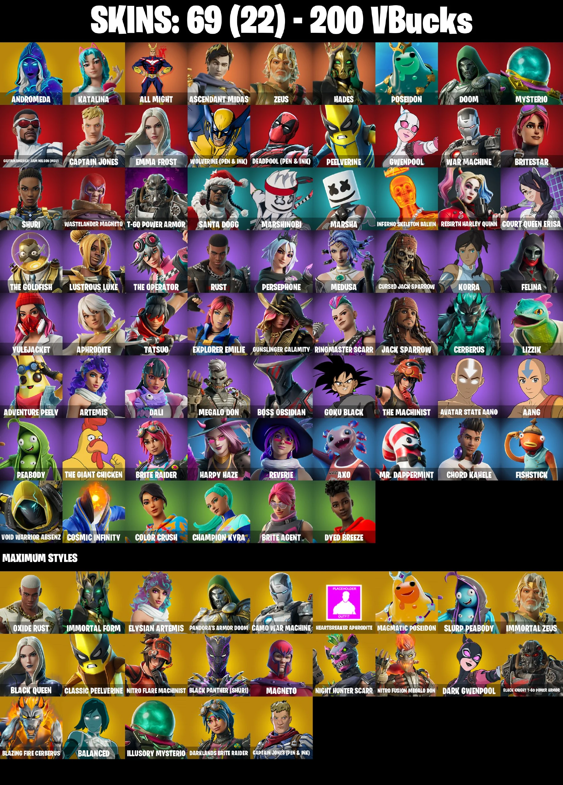 ⭐ [PC/PSN/XBOX/NINTENDO/MOBILE] 69 SKINS | ALL MIGHT | CAPTAIN AMERICA (SAM WILSON) | BRITESTAR | MARSHA | INFERNO SKELETON BALVIN | REBIRTH HARLEY QUINN | MARSHINOBI | PERSEPHONE | GOKU BLACK | AVATAR STATE AANG | THE GIANT CHICKEN | 200 VBUCKS | EMAIL