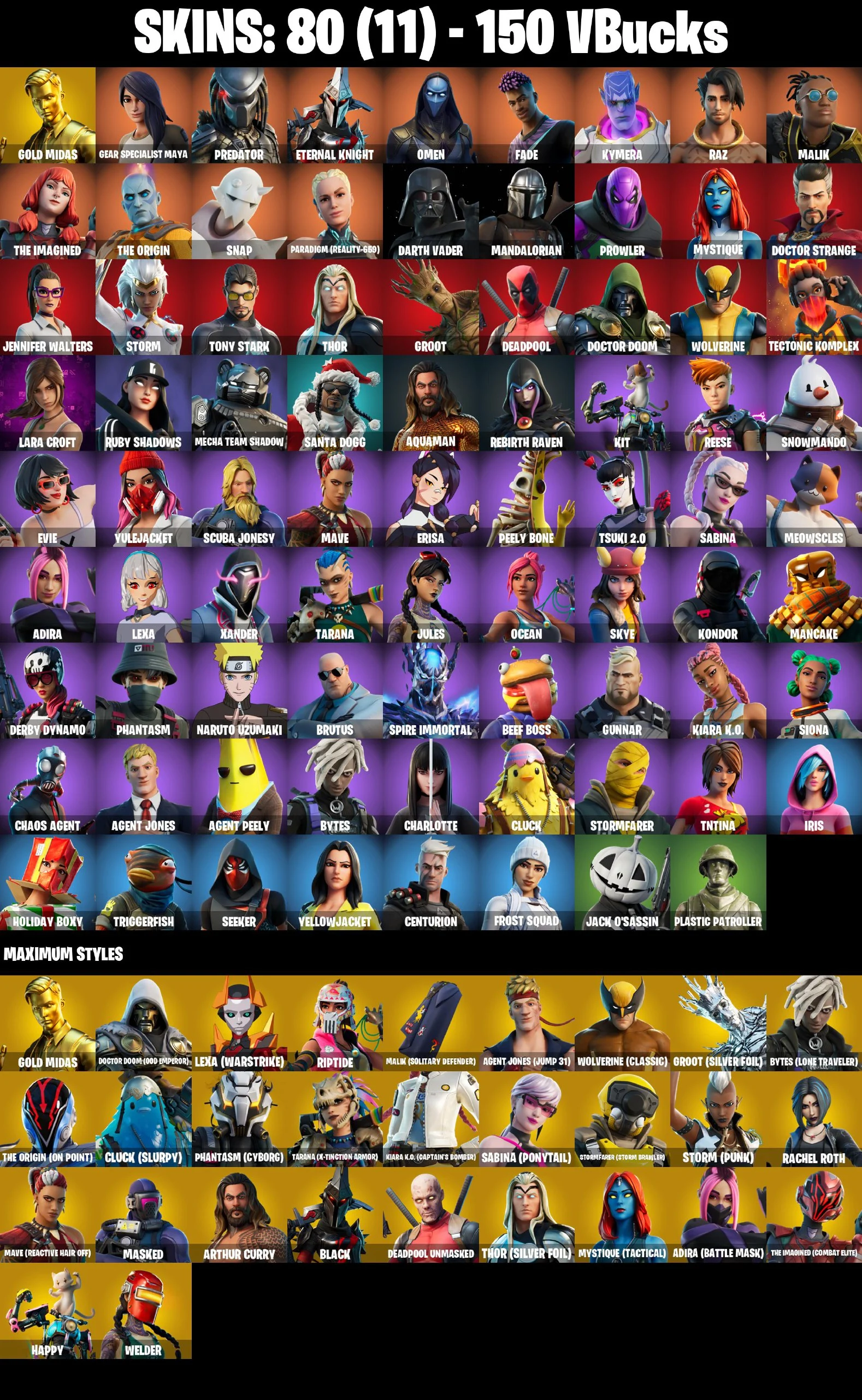 ⭐ [PC/PSN/XBOX/NINTENDO/MOBILE] 80 SKINS | GOLD MIDAS | OMEN | ETERNAL KNIGHT | FADE | DARTH VADER | MANDALORIAN | DEADPOOL | TONY STARK | MYSTIQUE | WOLVERINE | LARA CROFT | NARUTO UZUMAKI | EVIE | CHAOS AGENT | JULES | 150 VBUCKS | EMAIL