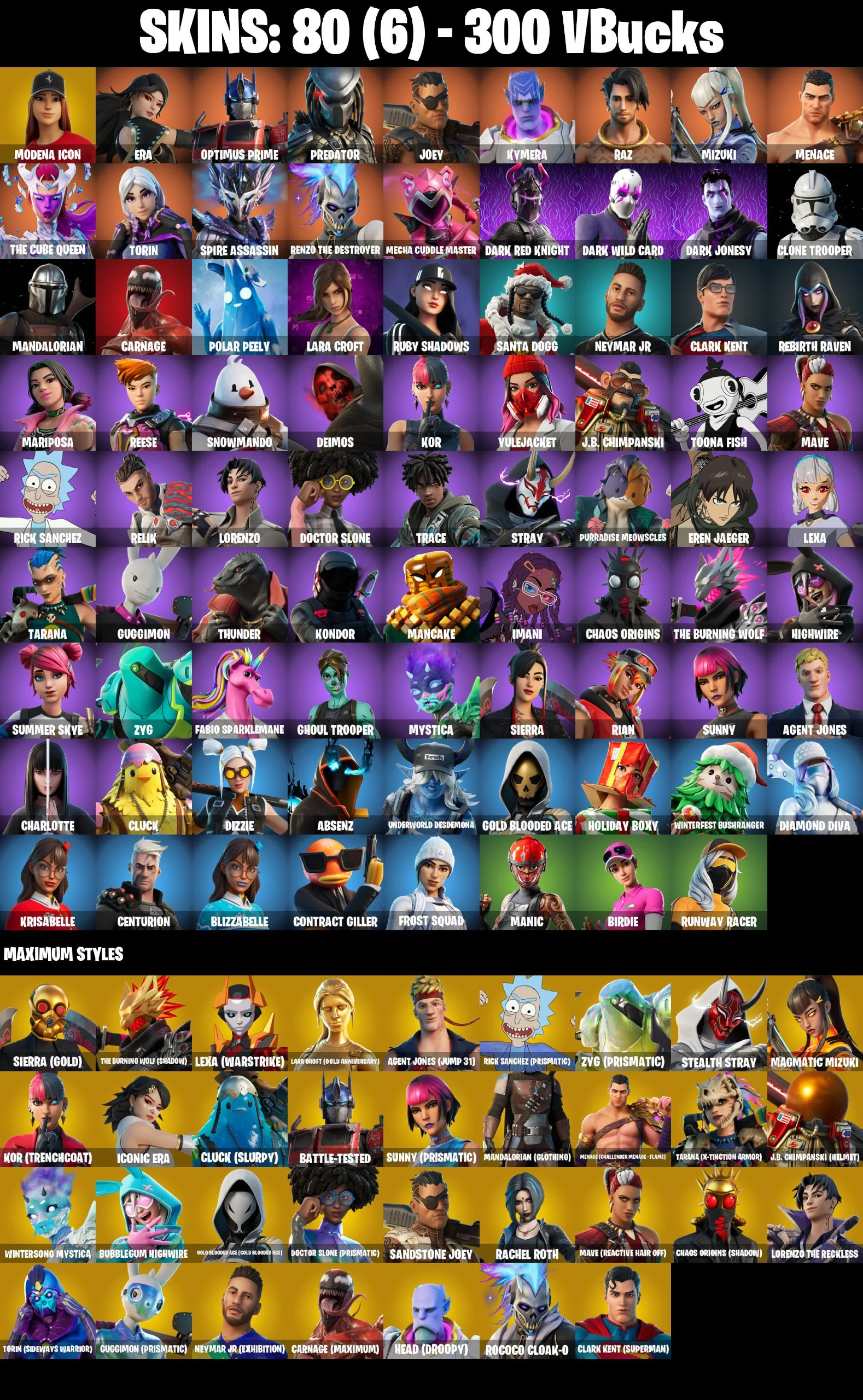 ⭐ [PC/PSN/XBOX/NINTENDO/MOBILE] 80 SKINS | MODENA ICON | THE CUBE QUEEN | MANDALORIAN | CARNAGE | CLONE TROOPER | REBIRTH RAVEN | CLARK KENT | EREN JAEGER | CHARLOTTE | GHOUL TROOPER | DOCTOR SLONE | SUMMER SKYE | KOR | SUNNY | BIRDIE | 200 VBUCKS | EMAIL