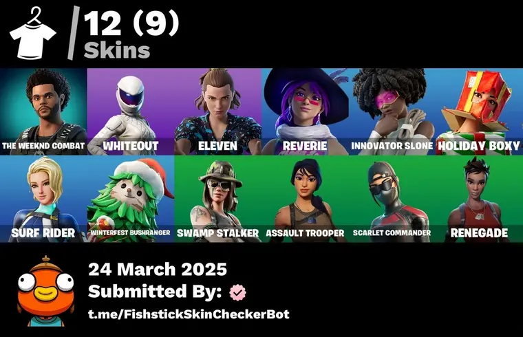 【PC/PSN/XBOX/SWITCH】 12 Skins | The Weeknd Combat | Eleven | Whiteout | Innovator Slone | Reverie | Holiday Boxy | Winterfest Bushranger | Surf Rider | 200 VB | FS30