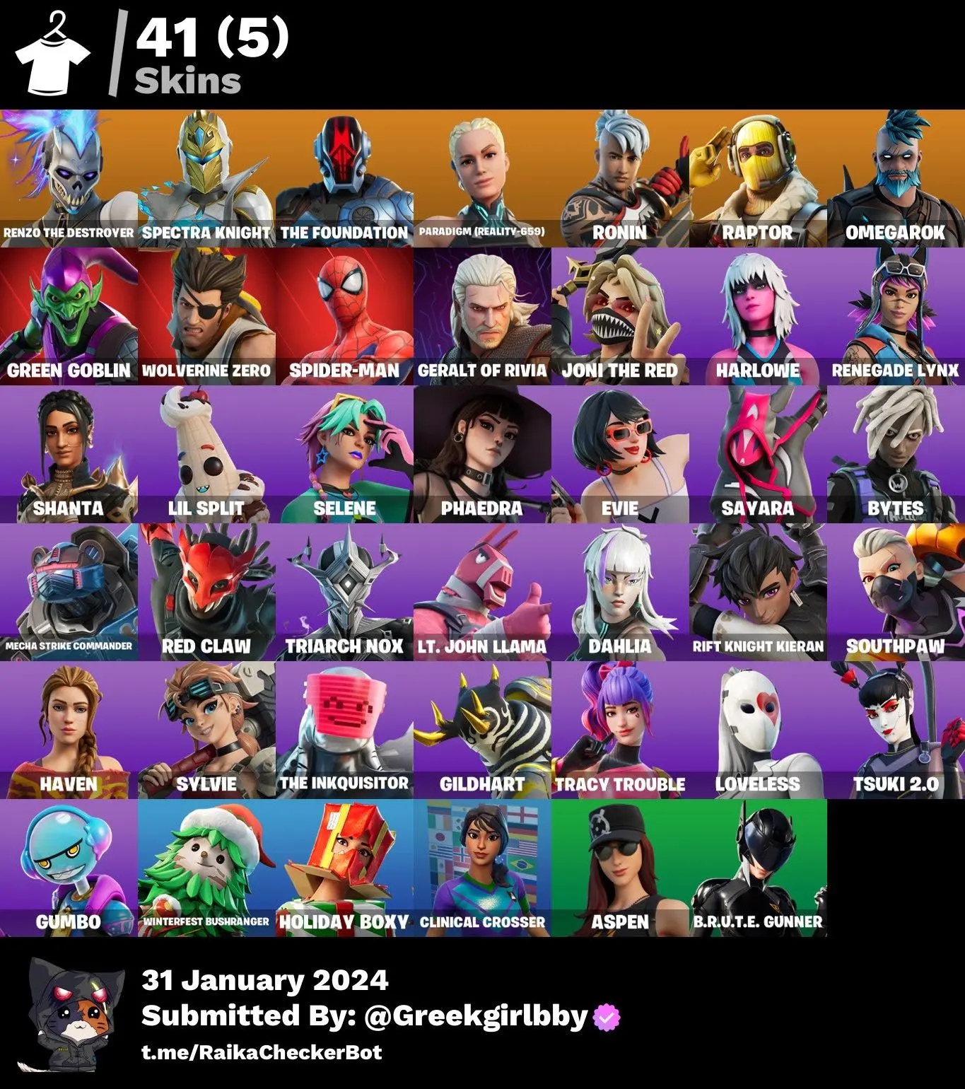 PC/XBOX] 41 skins | Renzo the Destroyer | Green Goblin | Goblin Glider | Paradigm (Reality-659) | Renegade Lynx| Raptor |