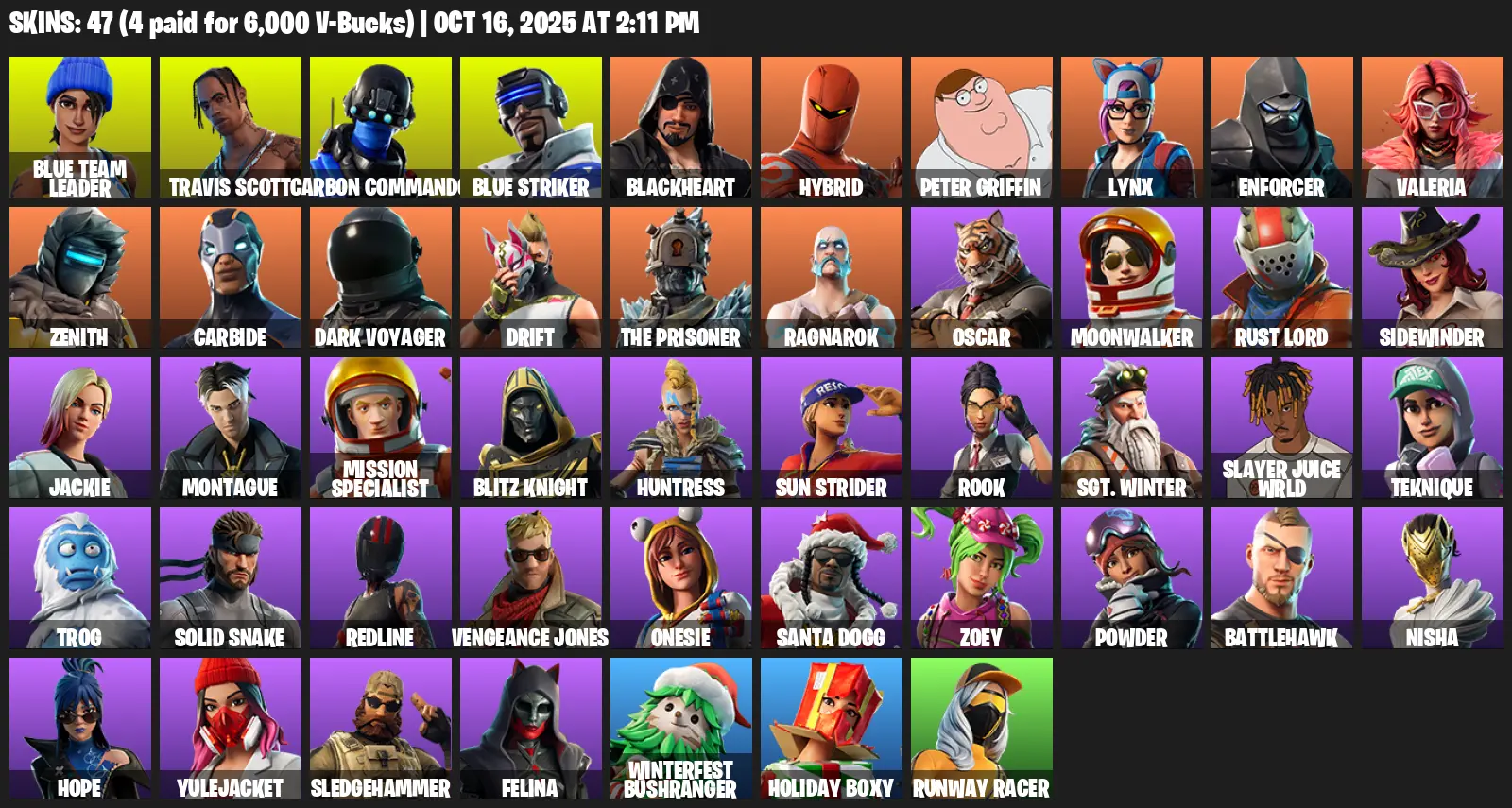 [PC/XBOX] | 47 skins | Take The L | Travis Scott | Blue Team Leader | Carbon Commando | Blue Striker | Blackheart | Hybrid | #GVT1493 | #MBFN