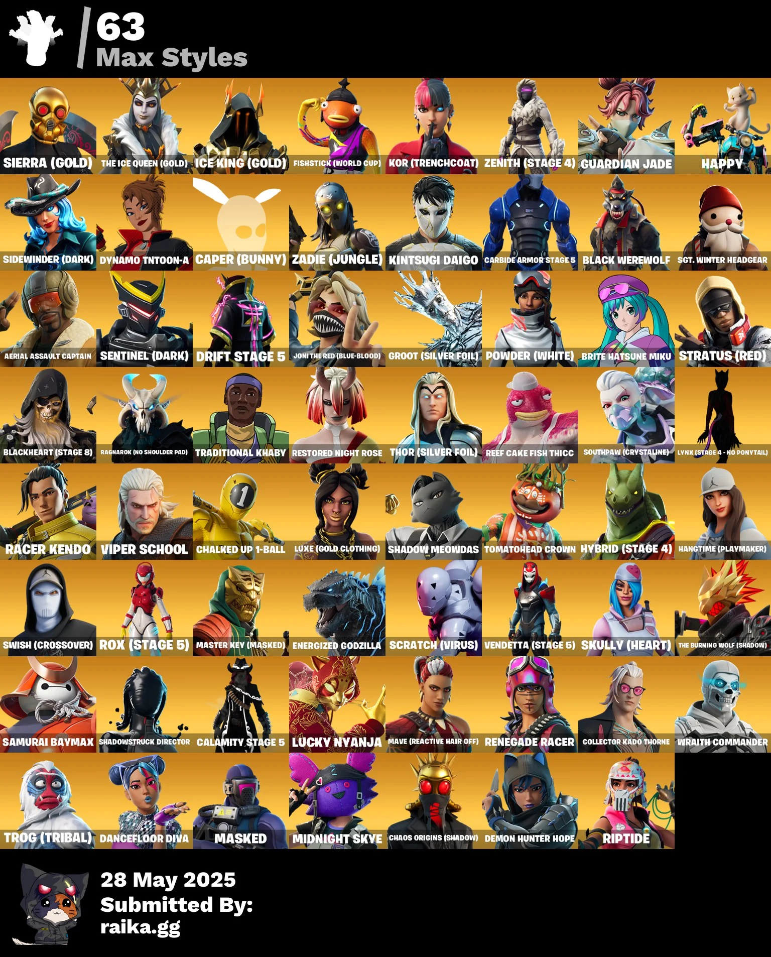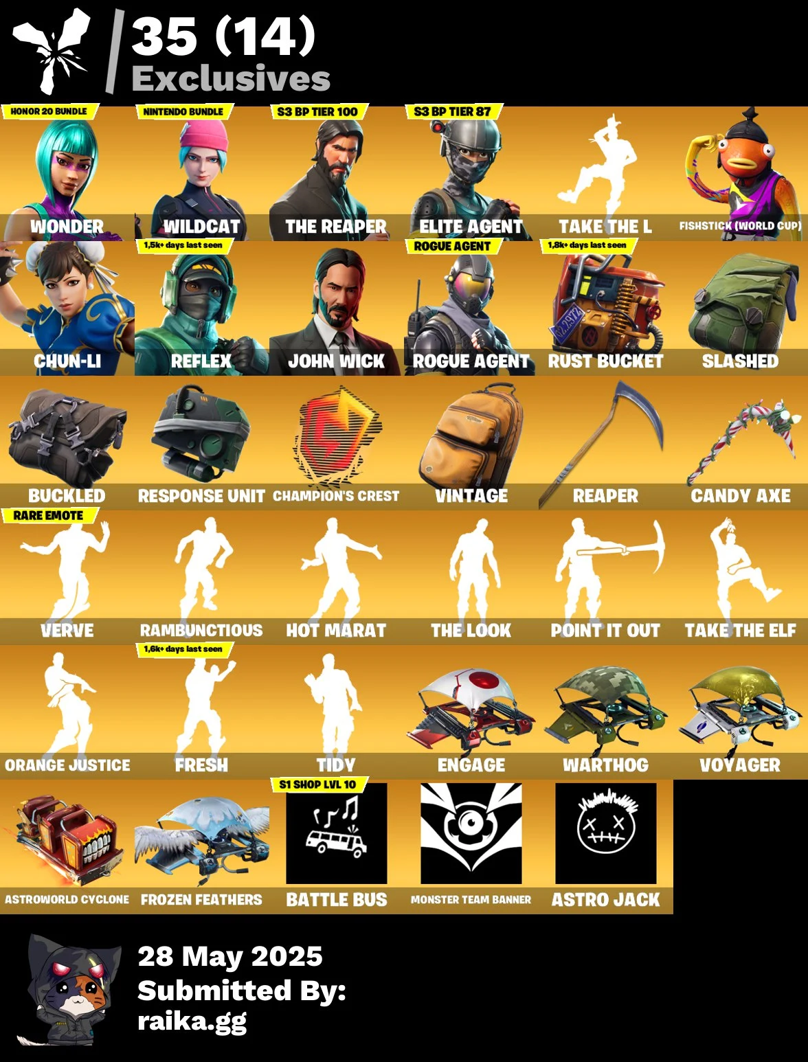 [PC/XBOX] 542 skins | Wonder | Wildcat | The Reaper | Elite Agent | Take The L | Renegade Raider | Fishstick (World Cup) | Chun-Li | Reflex | John Wick | 390 VB