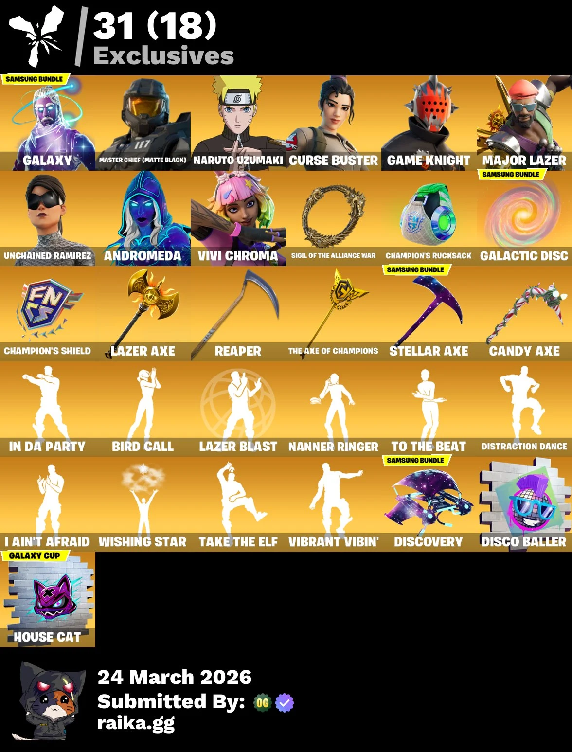 [PC/XBOX] 566 skins | Galaxy | Aerial Assault Trooper | Renegade Raider | Master Chief (Matte Black) | Naruto Uzumaki | Curse Buster | Game Knight | 1350 VB