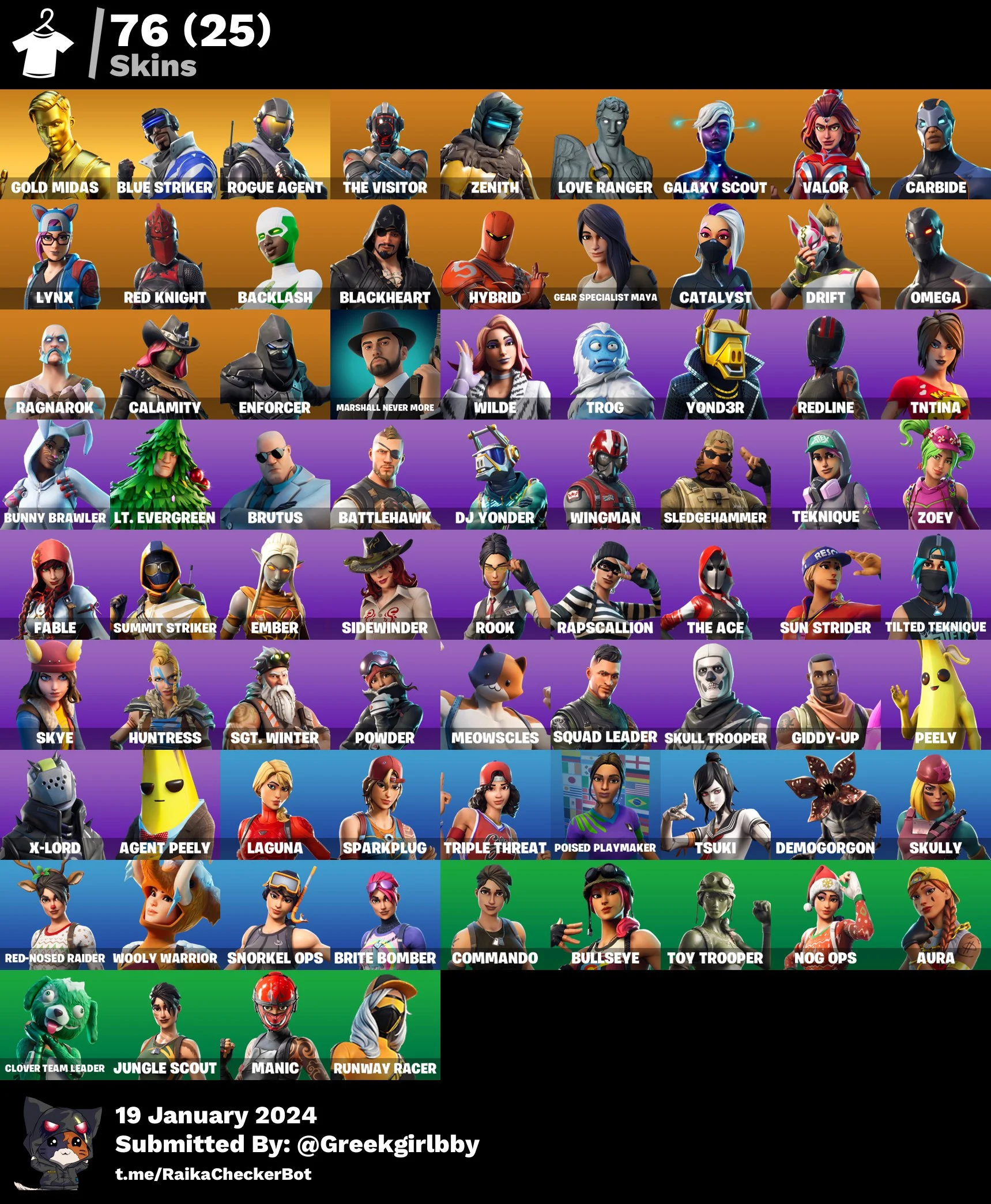 [PC/XBOX] 76 skins | Gold Midas | Blue Striker | Rogue Agent | The Visitor | Orange Justice| Galaxy Scout | Mail Guarantee