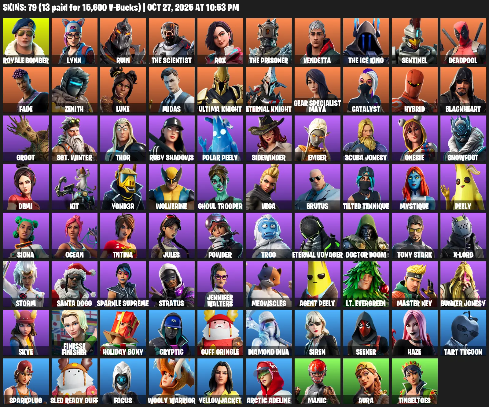 [PC/XBOX] | 79 skins | 600 V-bucks | Royale Bomber | Lynx | Ruin | The Scientist | Rox | The Prisoner | Vendetta | The Ice King | #AVE9692 | #MBFN